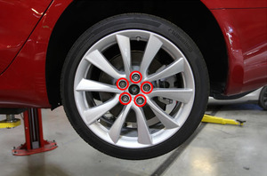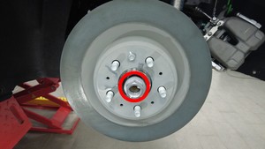 - 将液压轮毂拉拔器工具安装在 LH 后车轮支柱上,然后安装并用手拧紧轮毂螺母 (x5)。
