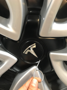 使用轮辋拆卸工具拆下左后轮毂中心盖。