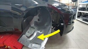 拆下将右前轮拱内衬前部固定到车辆的卡子(9 个),然后将轮拱内衬置于一旁,以便执行以下步骤。