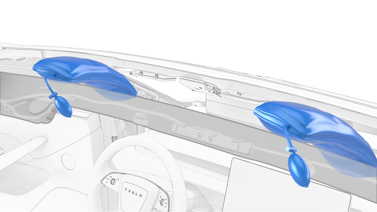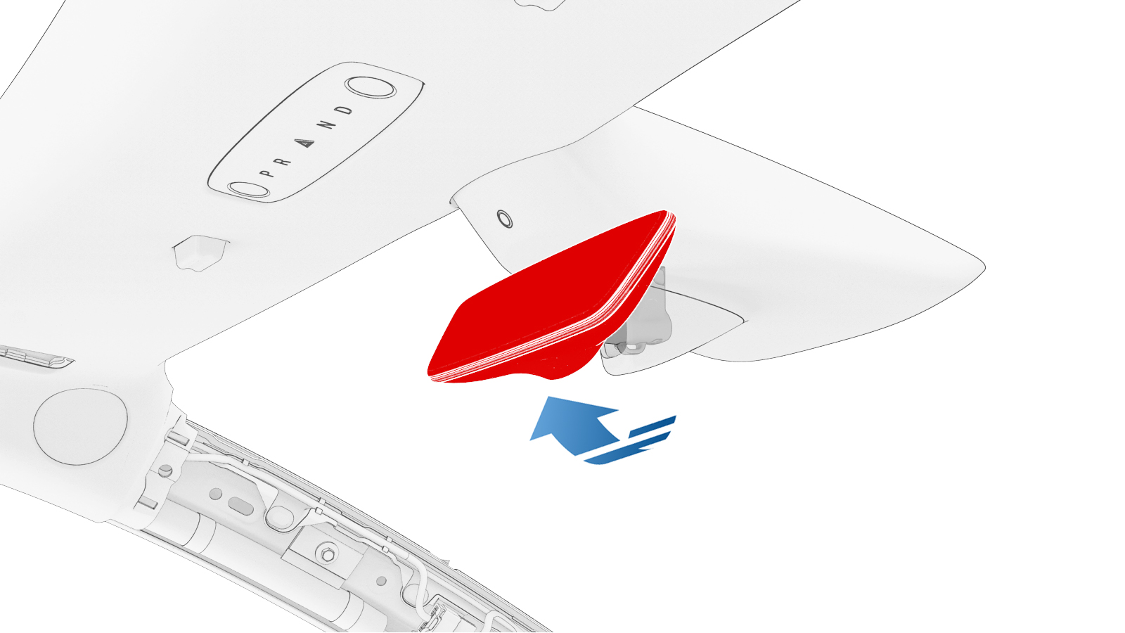 在顶篷和车身之间小心插入可充气袋(2 个),以便接触车顶控制台上的锁片。
