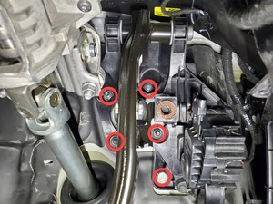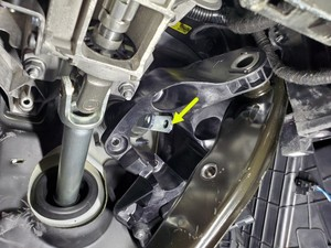 注将制动踏板总成从 iBooster 螺柱上松开。建议轻轻向外推动螺柱或杆,从而留出更多空间,以便拆卸踏板总成。如有必要,请他人协助向外拉动 iBooster,从而保持适当间距,以便将踏板总成从螺柱上拆下。