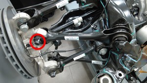 拆卸将右后上前连杆固定到转向节的螺栓和螺母。