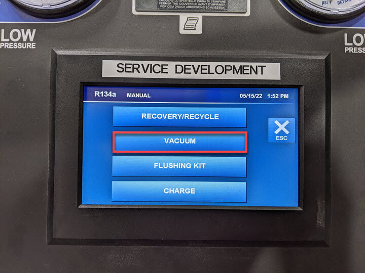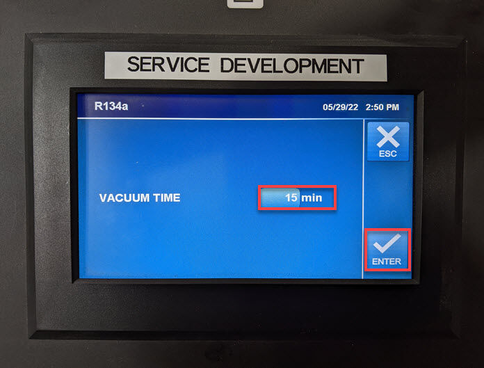 在空调机上,点击ENTER,点击,将真空时间设置为 15 分钟,再点击ENTER,然后按照空调机说明执行空调真空泄漏测试。