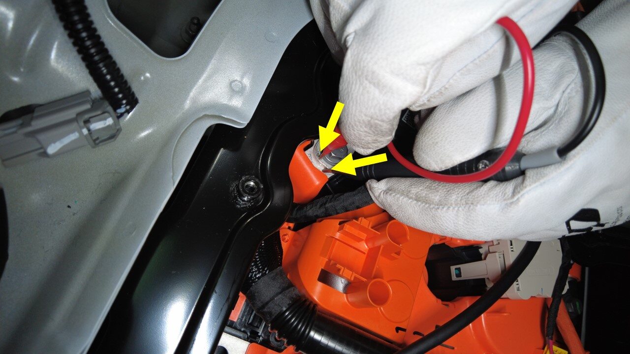 Remove nut securing negative pack contactor to HV battery tall silicon terminal