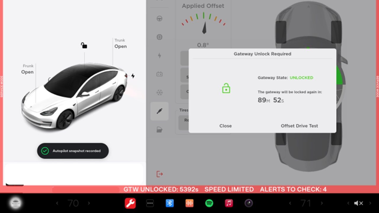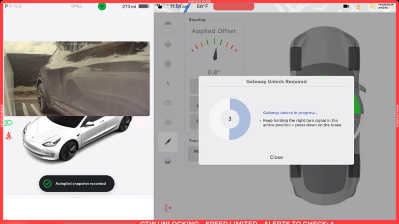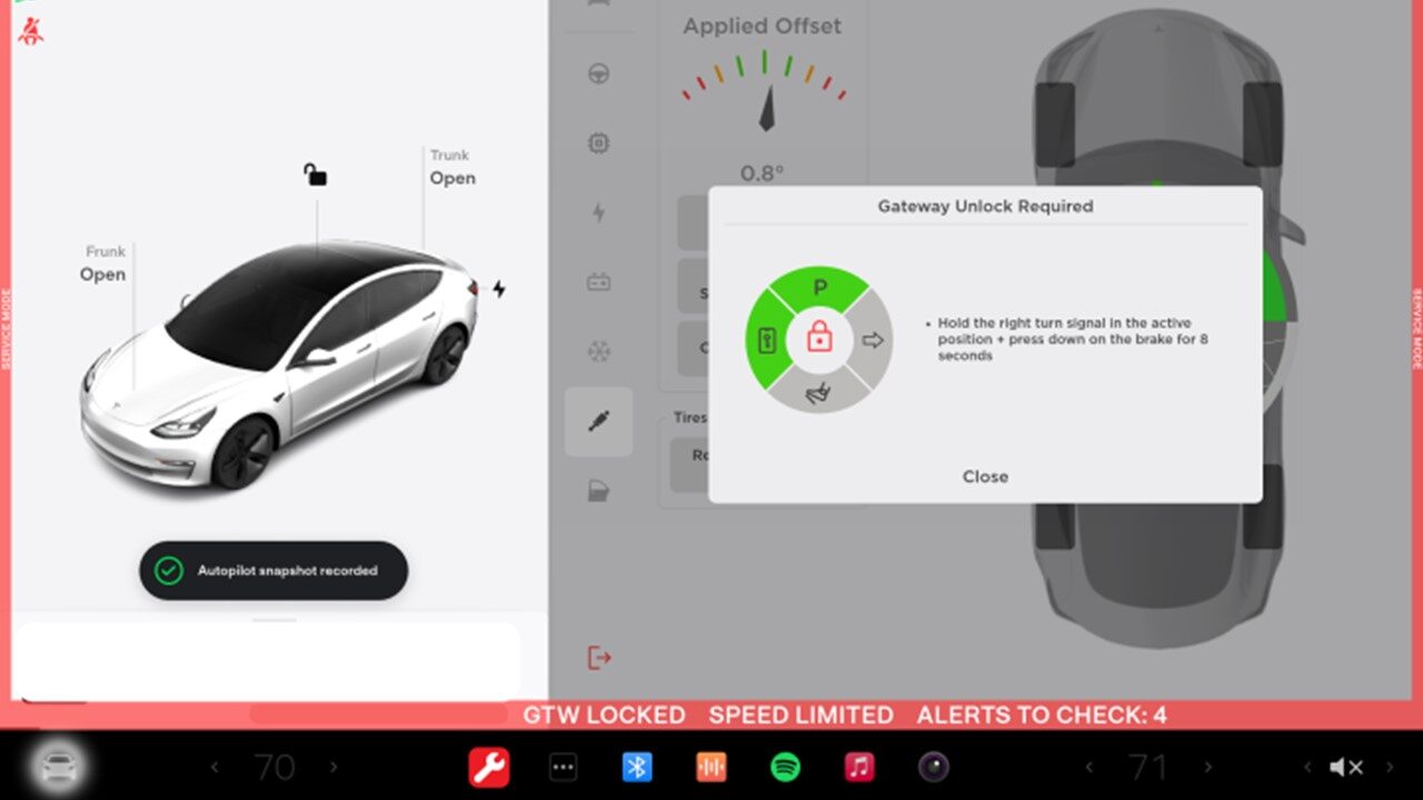 注将车辆置于“维护模式”后,将卡片钥匙放在中控台上以开启驱动导轨,踩住制动踏板,同时长按右转向灯按钮至少 10 秒,在这 10 秒钟内,UI 界面上的车辆识别号码旁边将弹出 “GTW UNLOCKING”。网关解锁后,UI 界面上的车辆识别号码旁边将显示 “GTW UNLOCKED 5400”,网关将保持解锁状态 90 分钟,请参考 Toolbox 文章 5582900 中的步骤获取其他信息