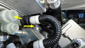 拆卸热交换器上的堵头,然后立即将前驱动单元动力总成回路软管连接到热交换器,并紧固夹子。