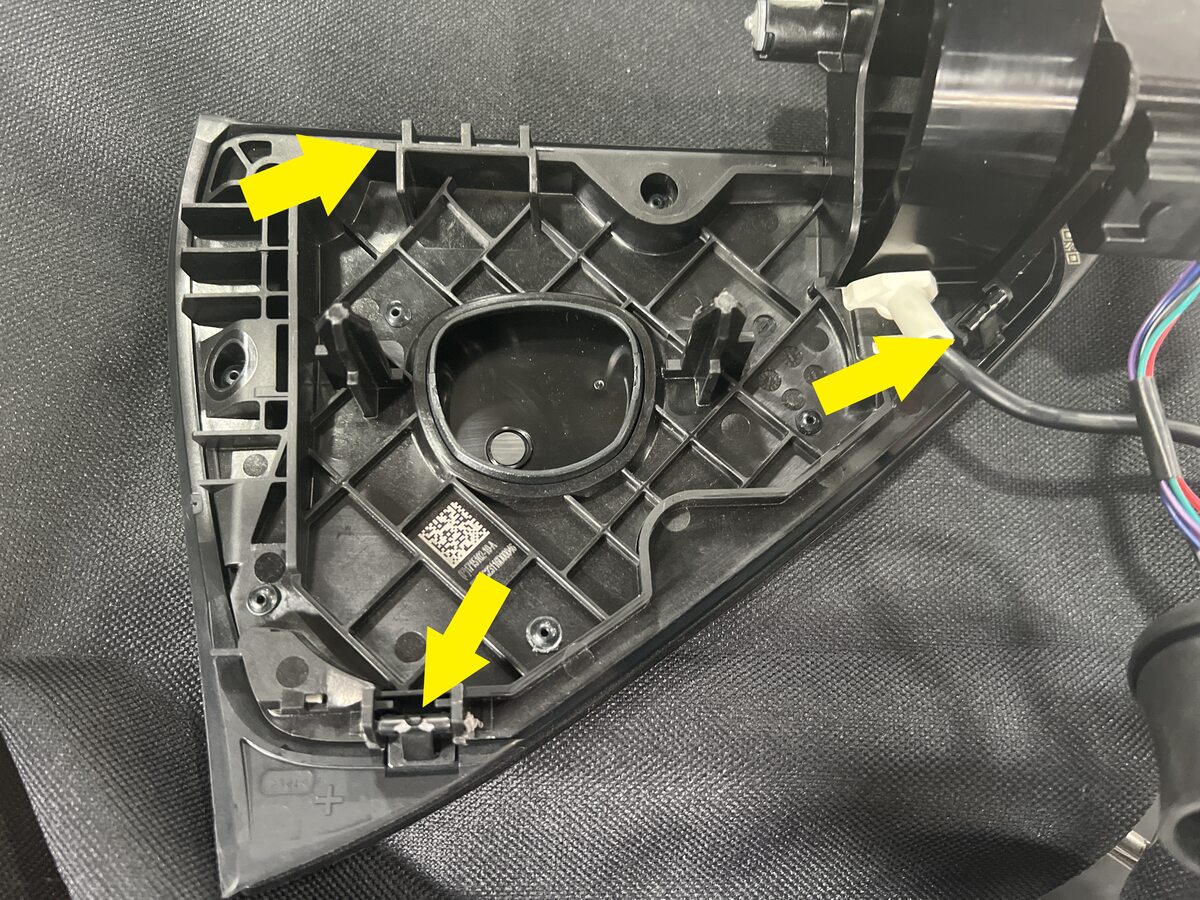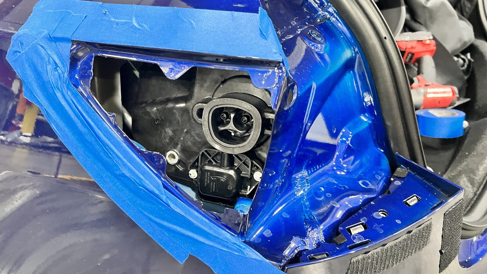 注2x tabs, 1x datum, Pull from the bottom rear to release, Pull the assembly towards the rear of the vehicle, when the door actuator reaches to the rear of the quarter panel pull the charge port down to clear the actuator mechanism then pull out and away from the body, Manipulating the charge door may be necessary to fully remove the assembly