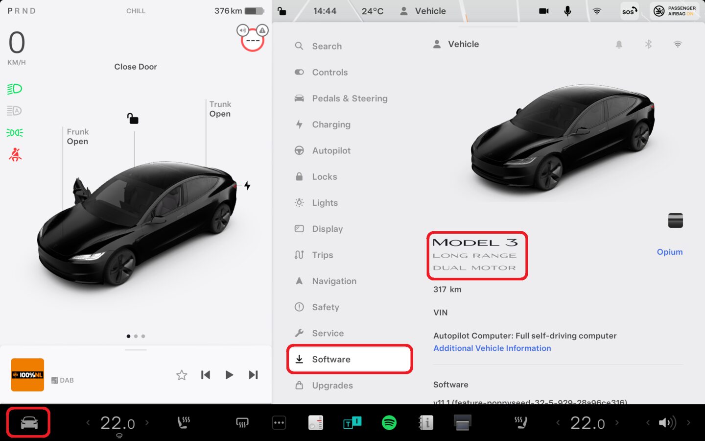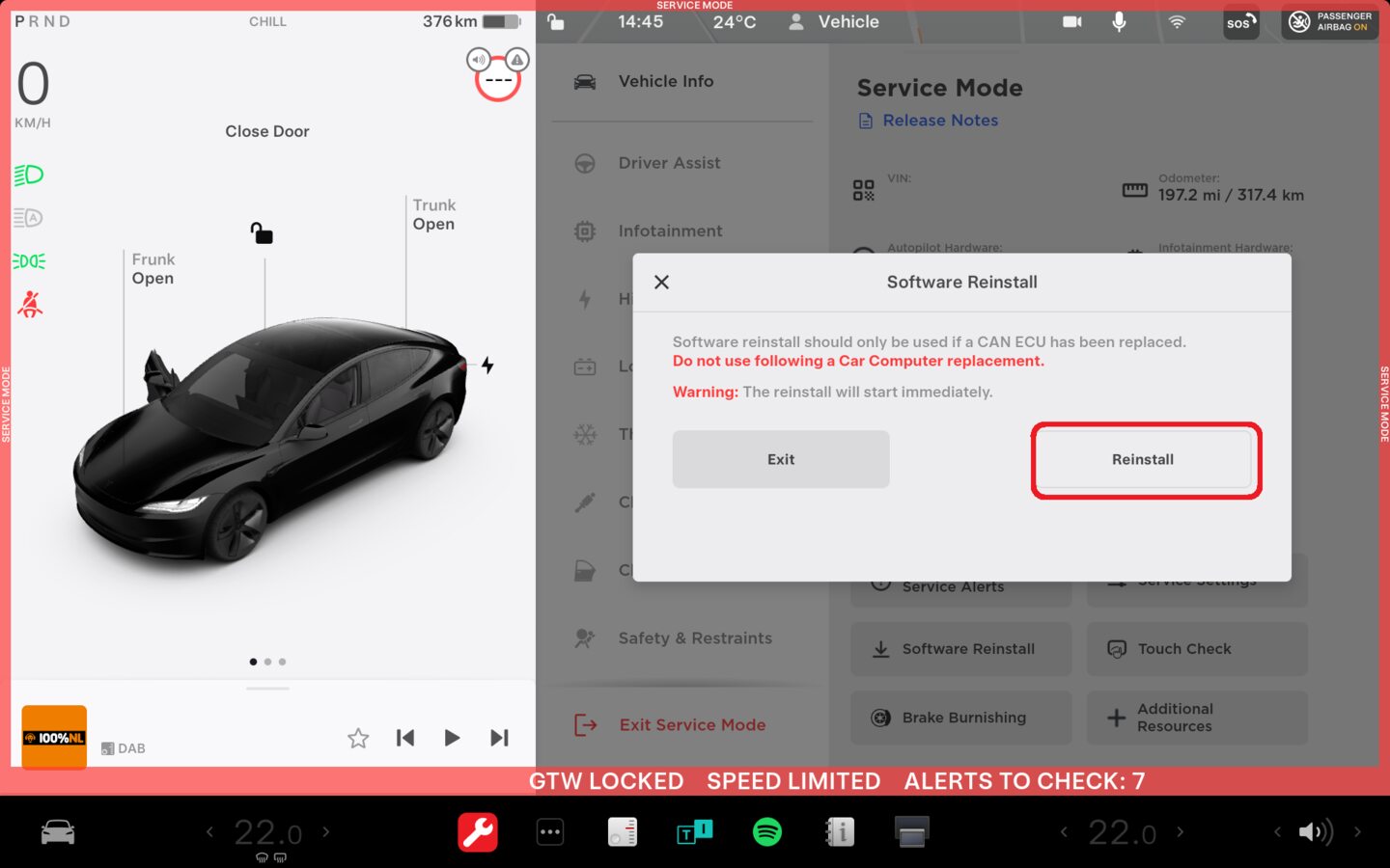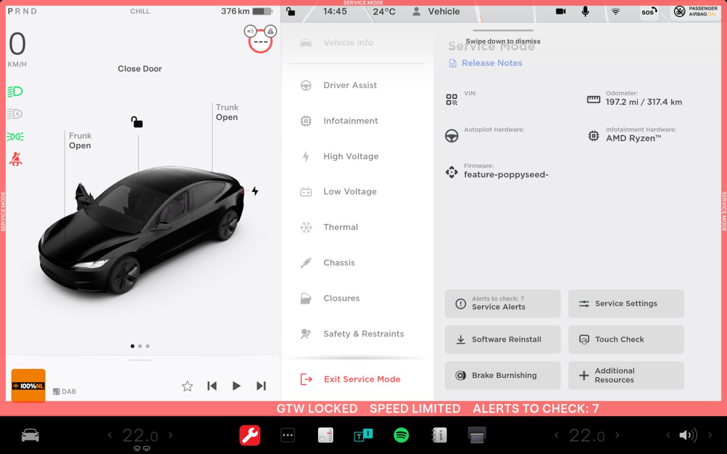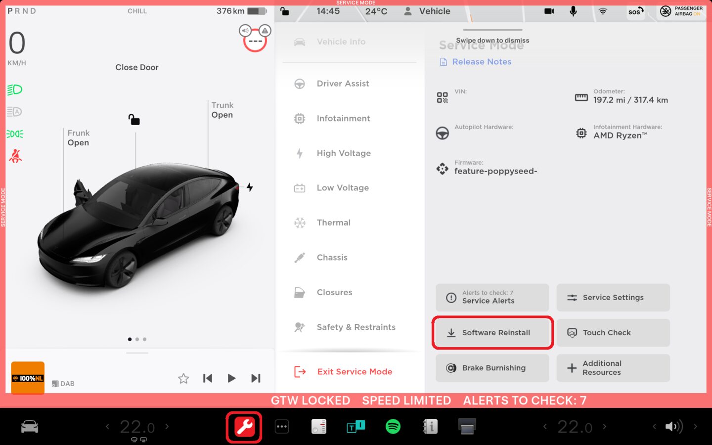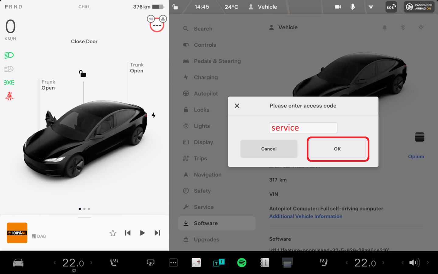 注Via UI > Controls > Software, Touch and hold "Model 3" for 4 seconds then release, Use screen keyboard to type "service" into dialog box then select OK