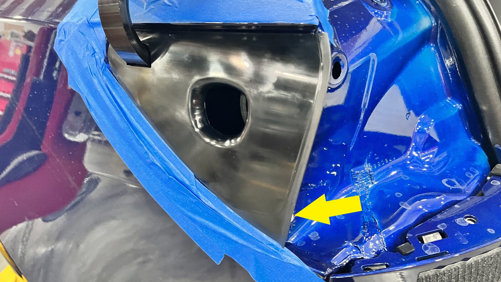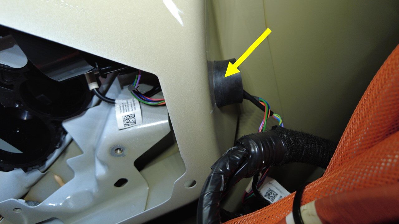注2x clips, 1x datum, Install the part by pivoting the assembly so the actuator mechanism clears underneath the quarter panel, then slide the charge door forward toward the rear door, When in position push down on bottom rear to engage clips, Manipulating the charge door may be necessary to fully align the assembly to the body