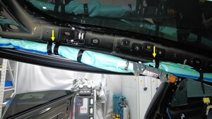 将右侧安全气帘安装到纵梁上,然后小心紧固将气囊固定到纵梁的卡子(8 个)。