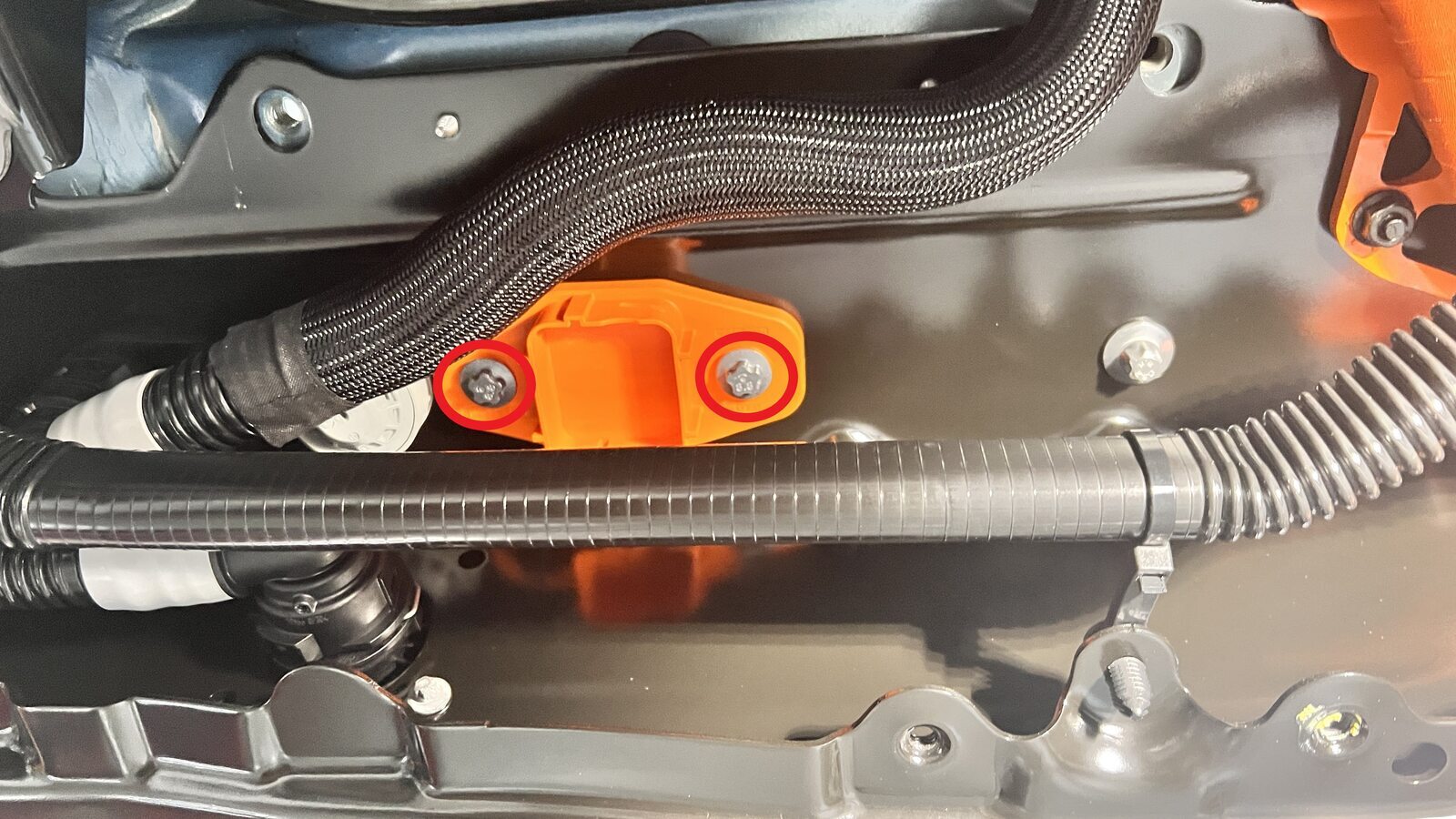 Torque bolts securing HV battery rear skid plate enclosure to vehicle.