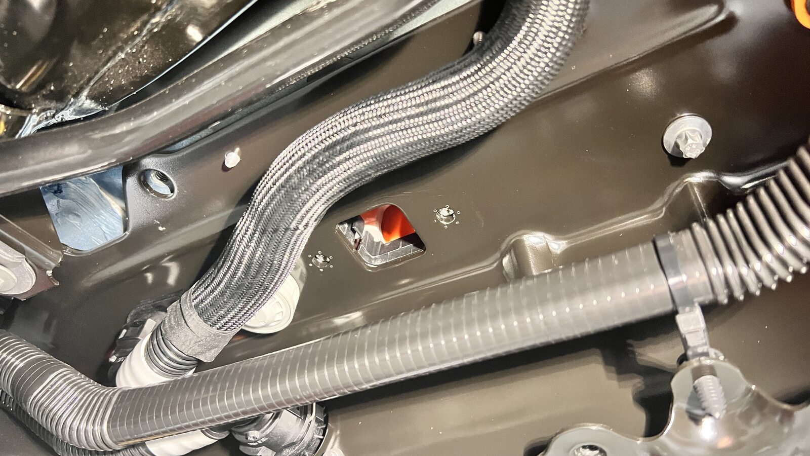Install RH side hose clips to HV battery rear skid plate enclosure .