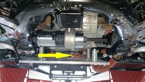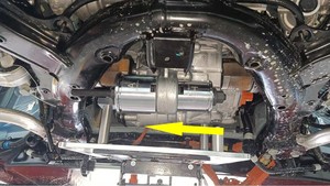 稍稍降下前驱动单元,调整举升支架旋钮,使电机倾斜 30 至 40 度,以将前驱动单元从副车架上分离。