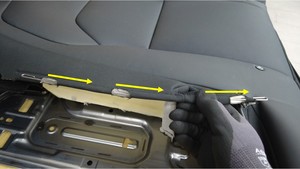 从左侧座椅靠背底部开始,轻轻将左侧座椅靠背扶手蒙皮扎线安装到左侧座椅靠背上。