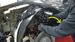 将螺旋弹簧和减震器总成安装到左前上方控制臂支座上。
