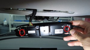 松开将前车顶控制台固定到顶篷的卡子(2 个),然后将控制台从顶篷上降下。