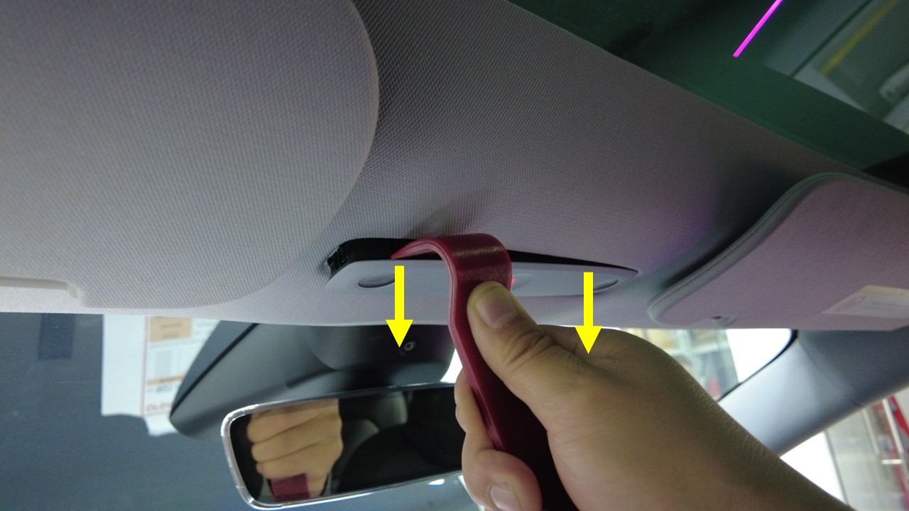 警告为避免损坏顶篷,切勿紧压顶篷撬动部件。在顶灯附近插入 90 度饰板工具,然后向下拉动工具以松开卡子,然后移至另一侧,松开剩余卡子。