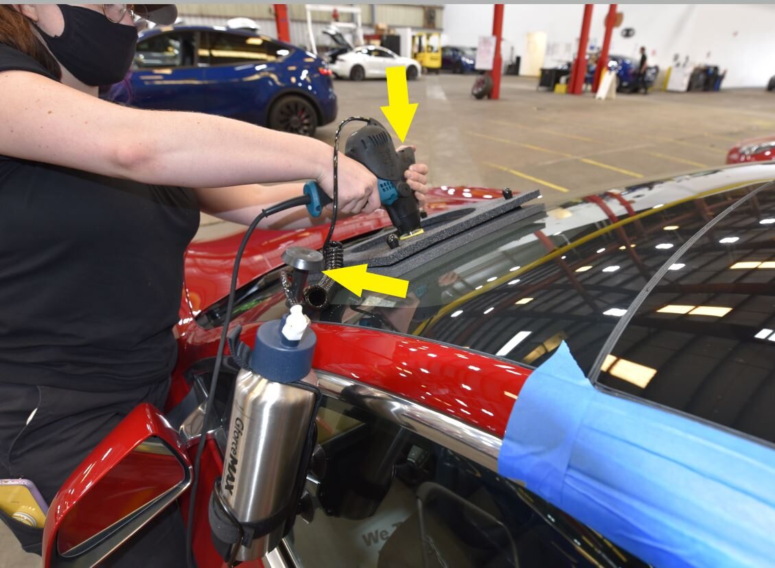 Re-pressurize the water feed bottle, and then repeat step 13 to finish polishing the windshield in the direction of the scratch.