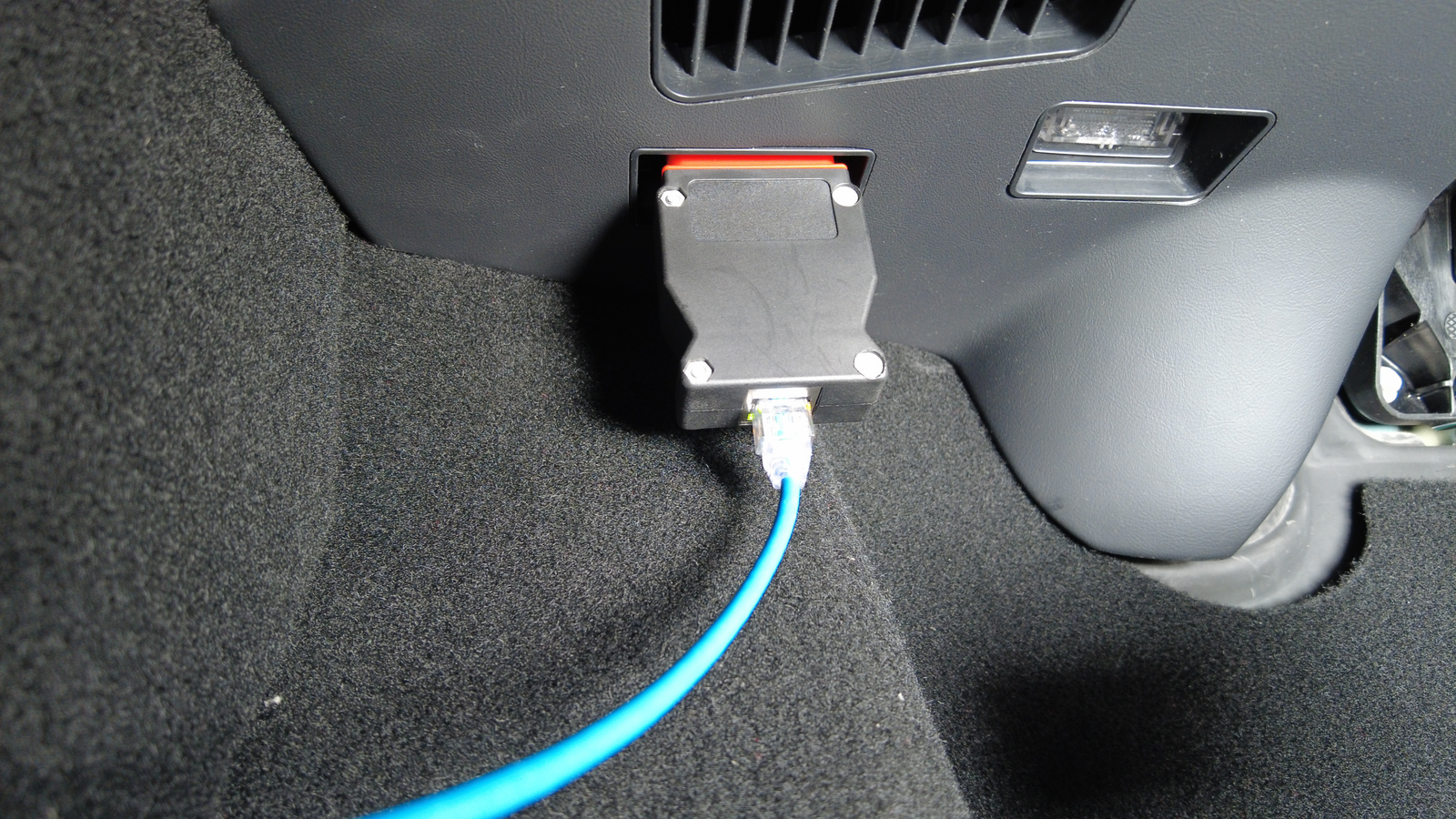 将车辆接口电缆连接到笔记本电脑和位于 LH 脚部空间中的车辆接口连接器。
