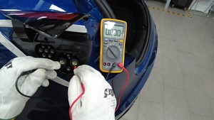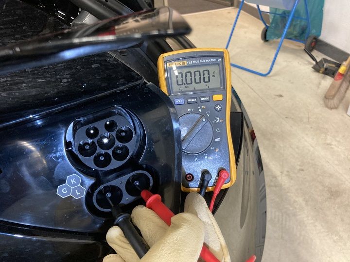 使用带超薄测试探针的万用表检查直流充电接口端子 B+ 和 B- 处的电压。