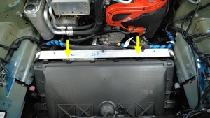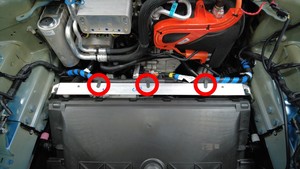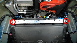 拆卸前备箱加固支架上的线束夹(3 个)。