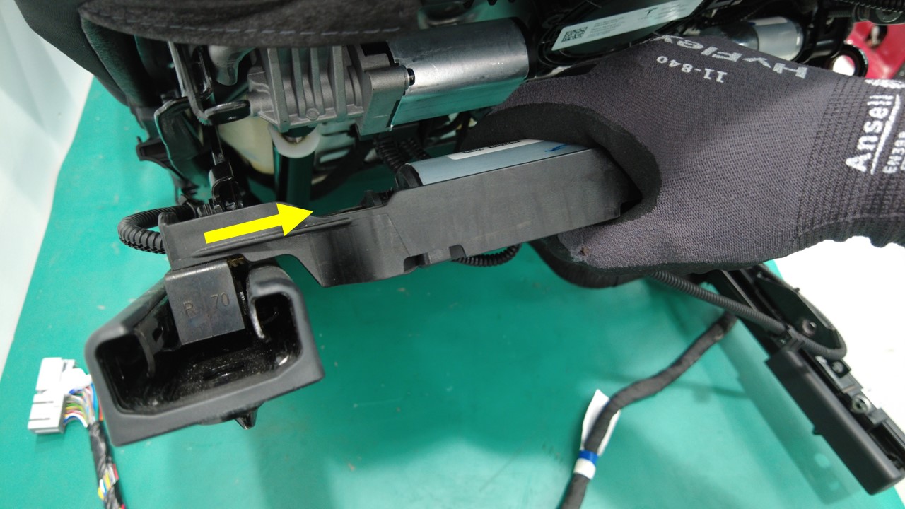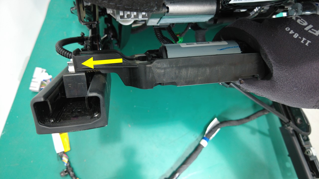 在协助下,将线束夹(3 个)安装到左前座椅滑轨电机桥架总成。