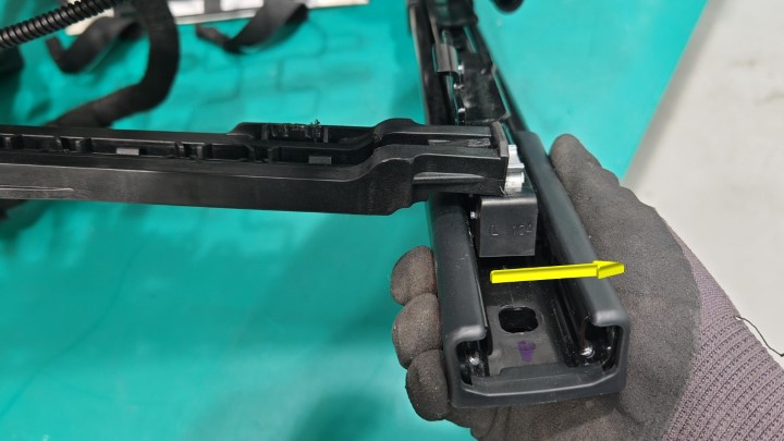 在协助下,将左前座椅滑轨电机桥架总成安装到内侧座椅滑轨上。