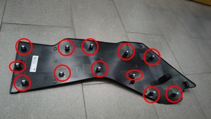 松开将中控台侧面板固定到中控台的卡子(12 个)、定位夹(2 个)和锁片,然后将侧面板从车上拆下。
