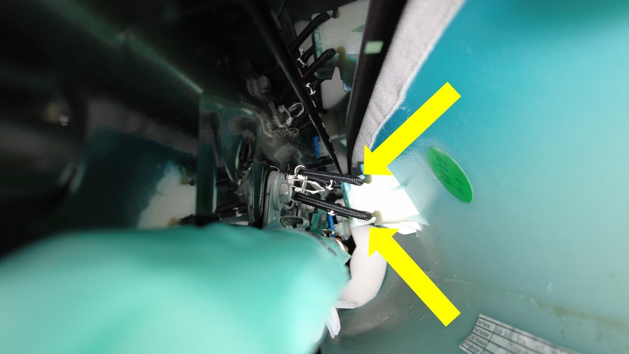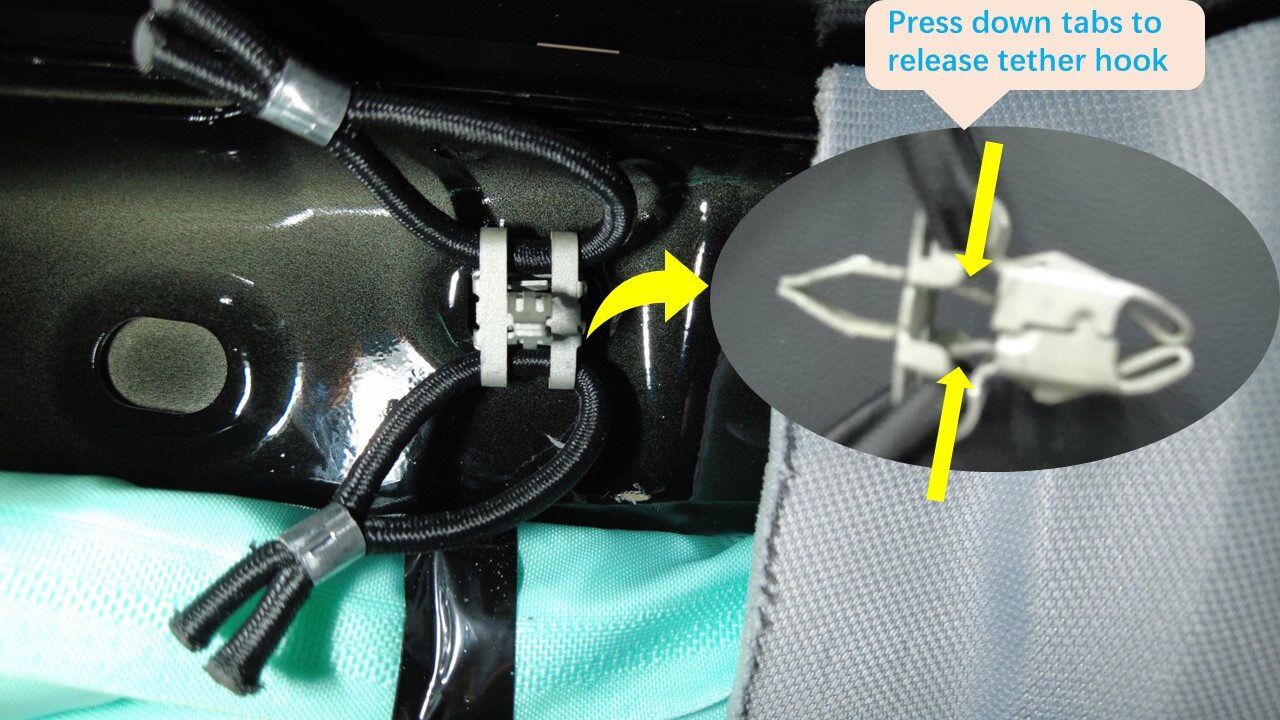 注4x clips, 2x locations, 4x tethers, Pull the upper corner of the side rail then work your way to bottom, Pull the lower side rail toward RH to release clips, Release tethers from bolted bungee tether