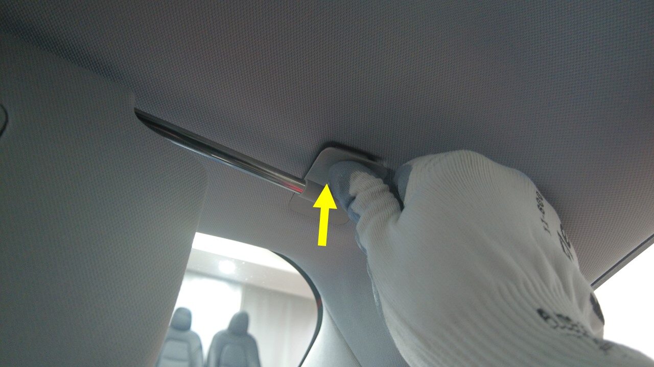 注4x clips, 2x locator pins,Align the locating pin of the roof liner with the slot, and then push in the direction of the arrow to install the clip, ensuring that the seal overlaps with the trim
