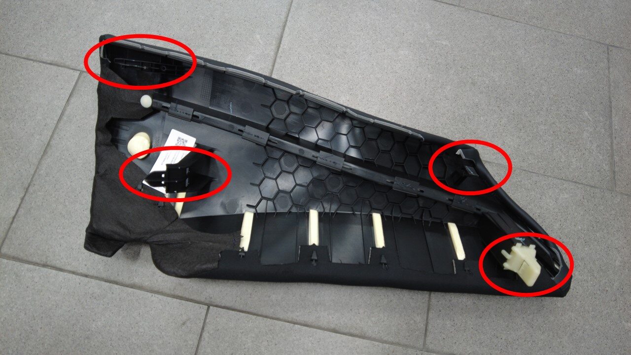 注3x clips, 3x tabs, Pull rear C-pillar inward then forward to remove