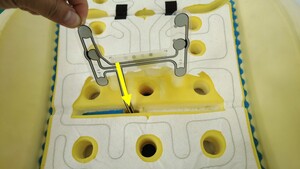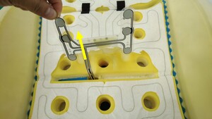揭下胶面保护条,将占用传感器安装到左前座垫上。