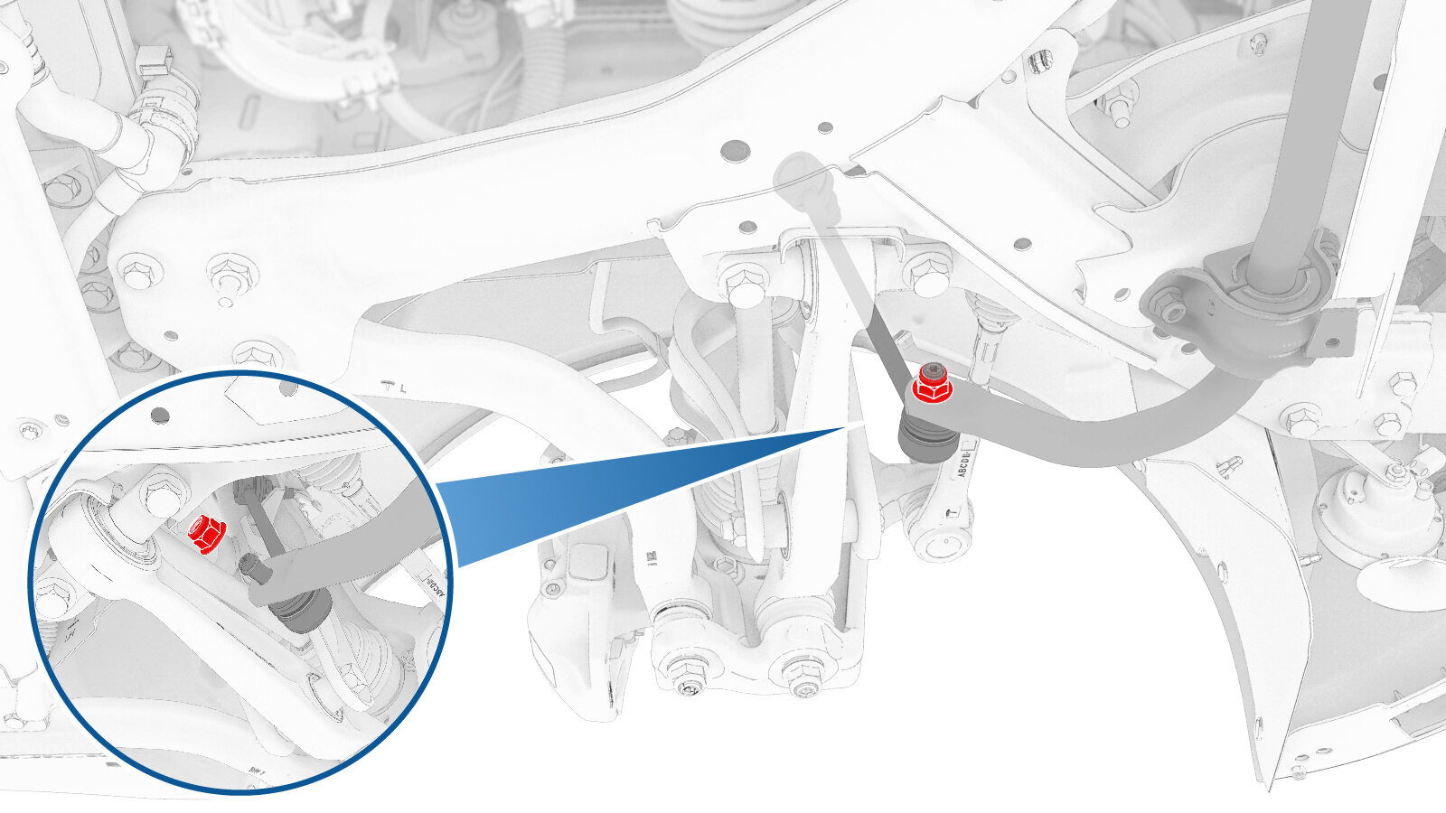 将左前平衡杆连杆放置到前平衡杆上,安装新的螺母,将连杆固定到平衡杆,紧固螺母,然后用油性记号笔标记螺母。