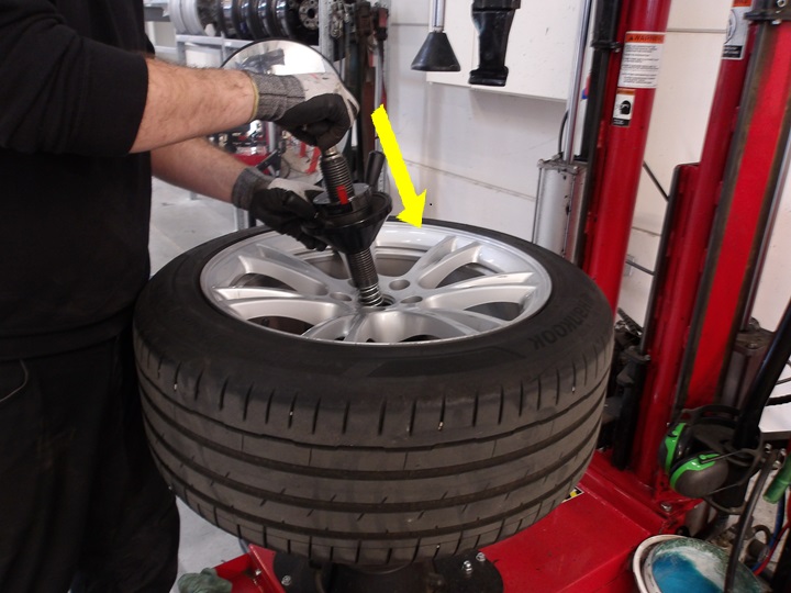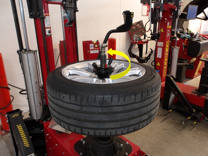 将轮毂放置在换胎机上,插入中心夹并紧固中心夹上的锥体。