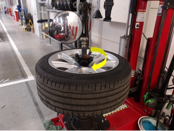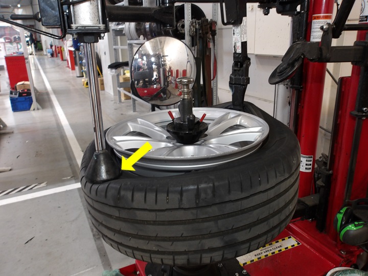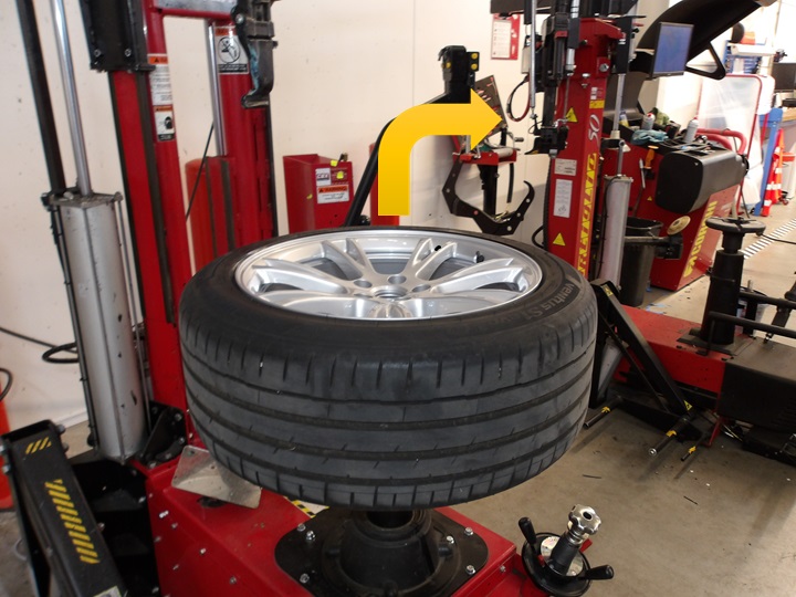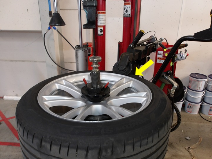 注确保将胎压监测系统 (TPMS) 传感器放置在换胎机臂的前方。