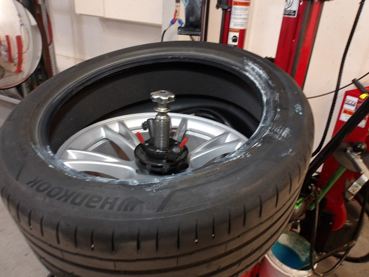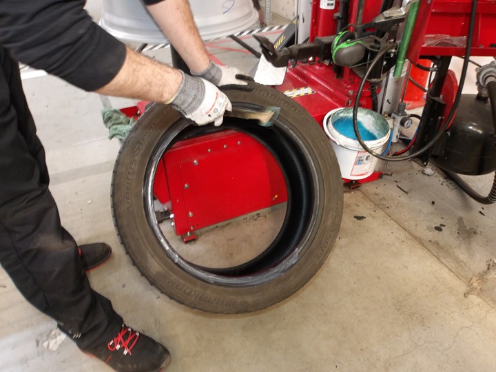 彻底润滑上下胎圈,然后将轮胎安装到轮辋上。