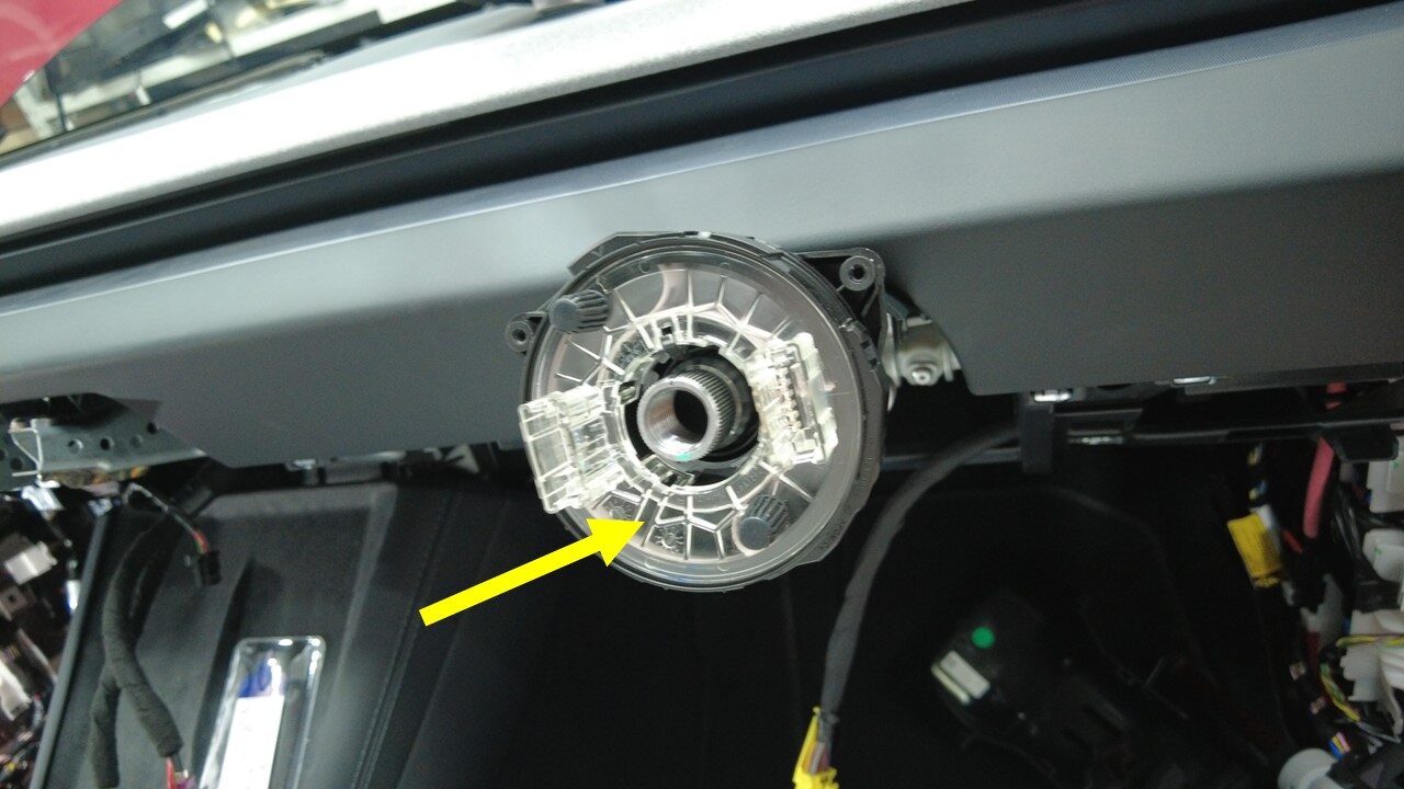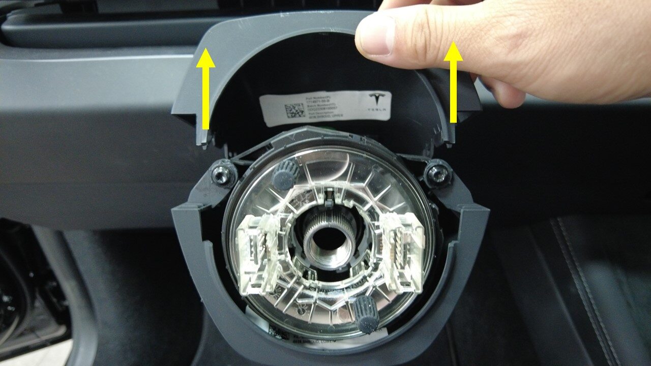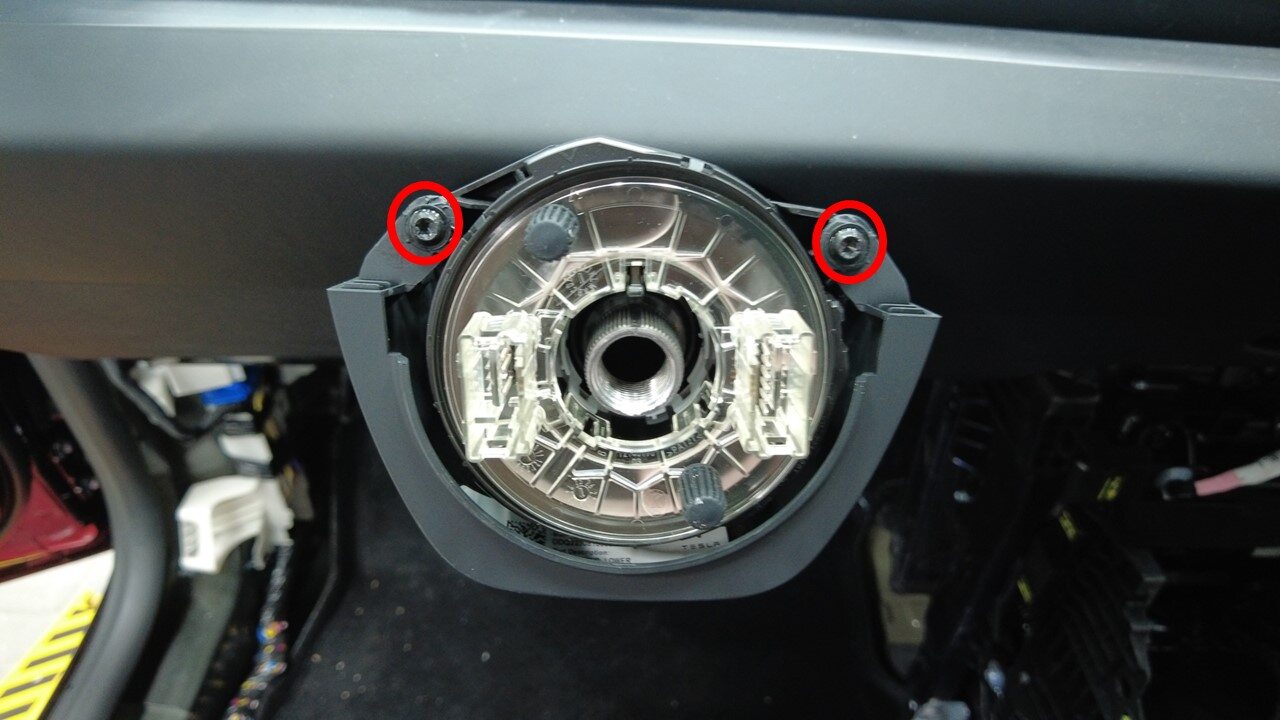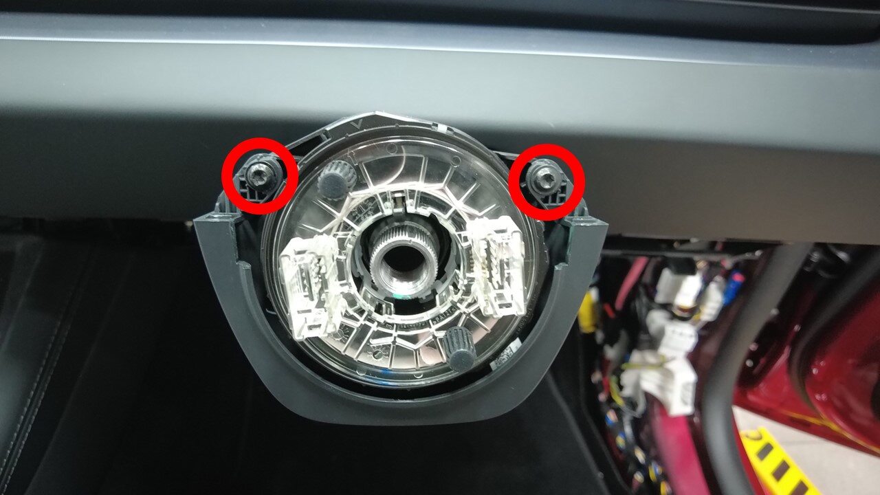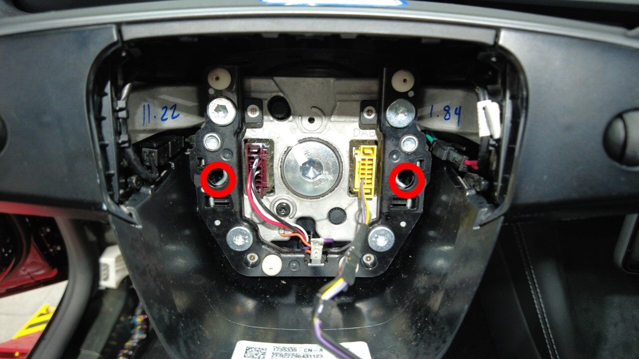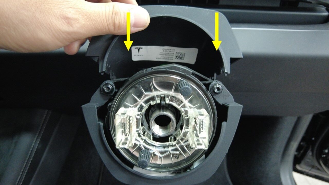注2x spring clips, 2x datums, Press the spring simultaneously from two access holes to release, Access holes located at 4 and 8 o’clock position, Do not insert tool too far as air bag connector could be damaged