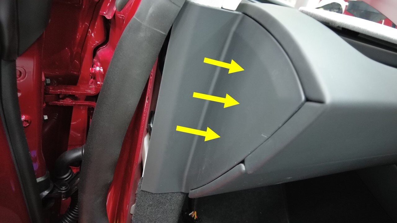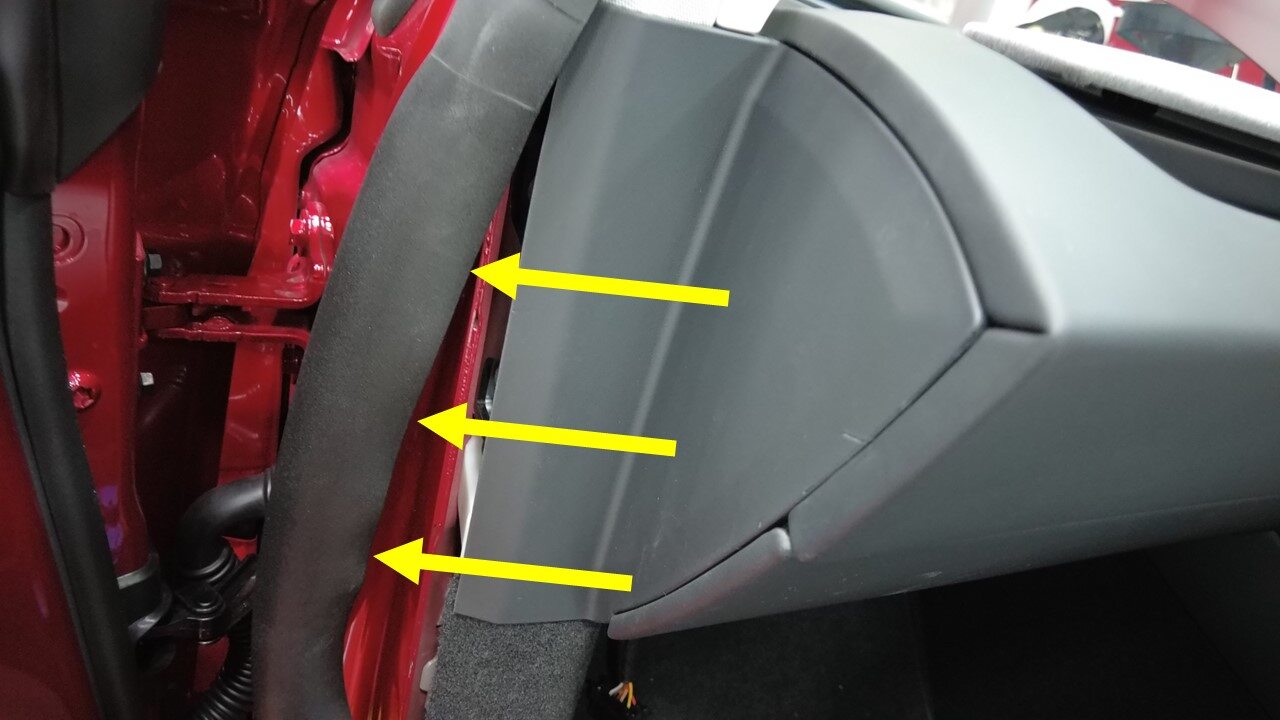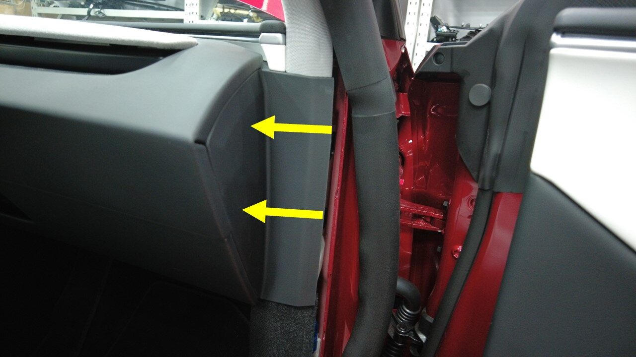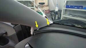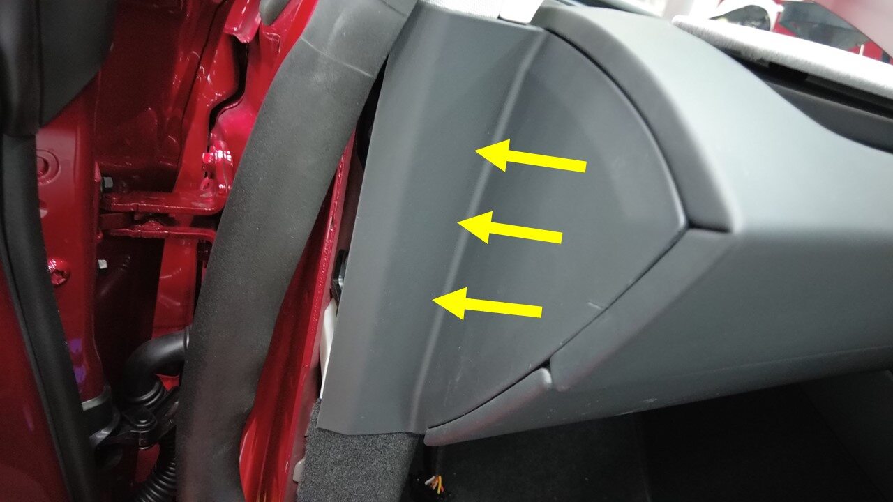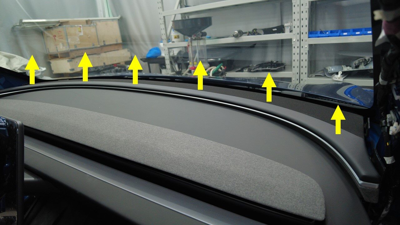 注6x clips, 1x metal clip, 2x guide tabs, 1x alignment pin, Slide bottom of trim along IP and speaker grill, attach tether to body side, Set clips starting at the bottom then work up, Pull seal over trim