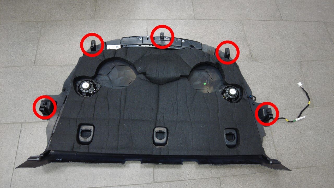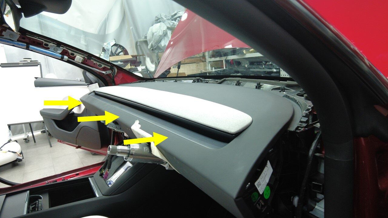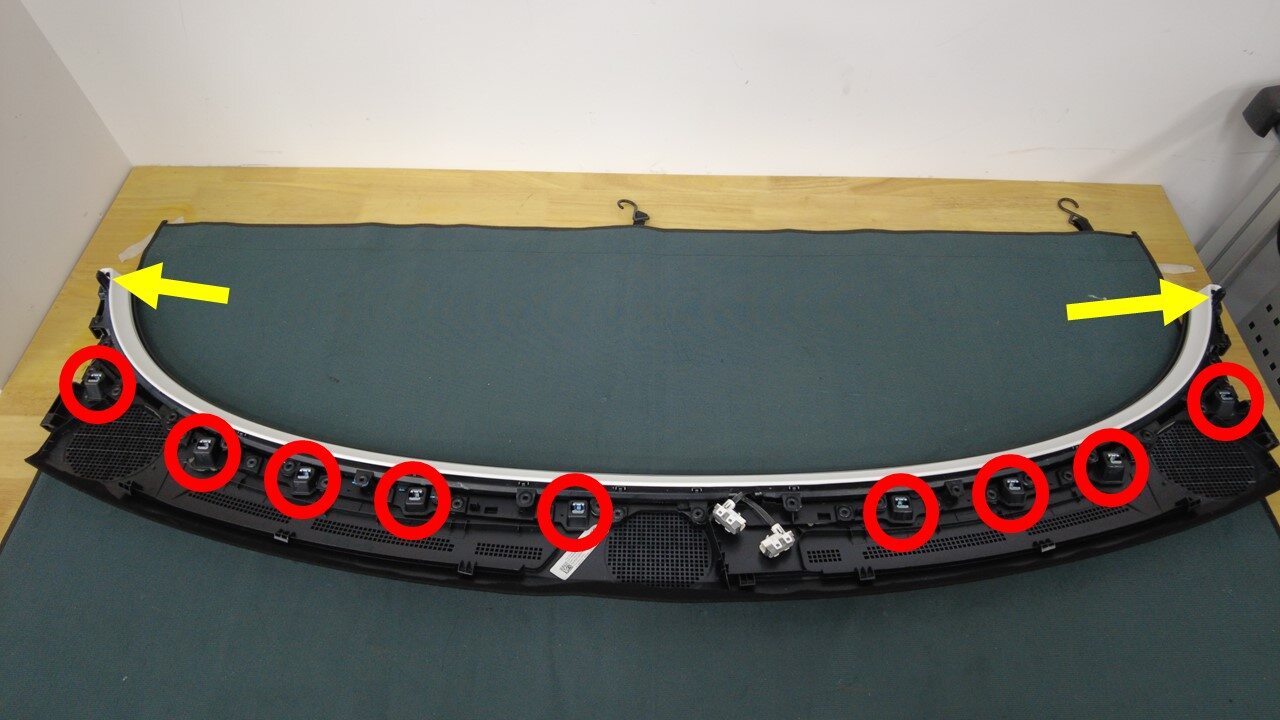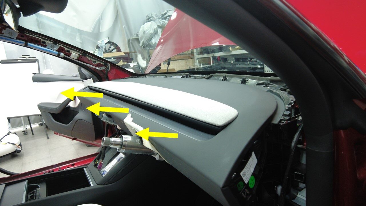 注6x clips, 1x metal clip, 2x guide tabs, 1x alignment pin, Slide bottom of trim along IP and speaker grill, attach tether to body side, Set clips starting at the bottom then work up, Pull seal over trim