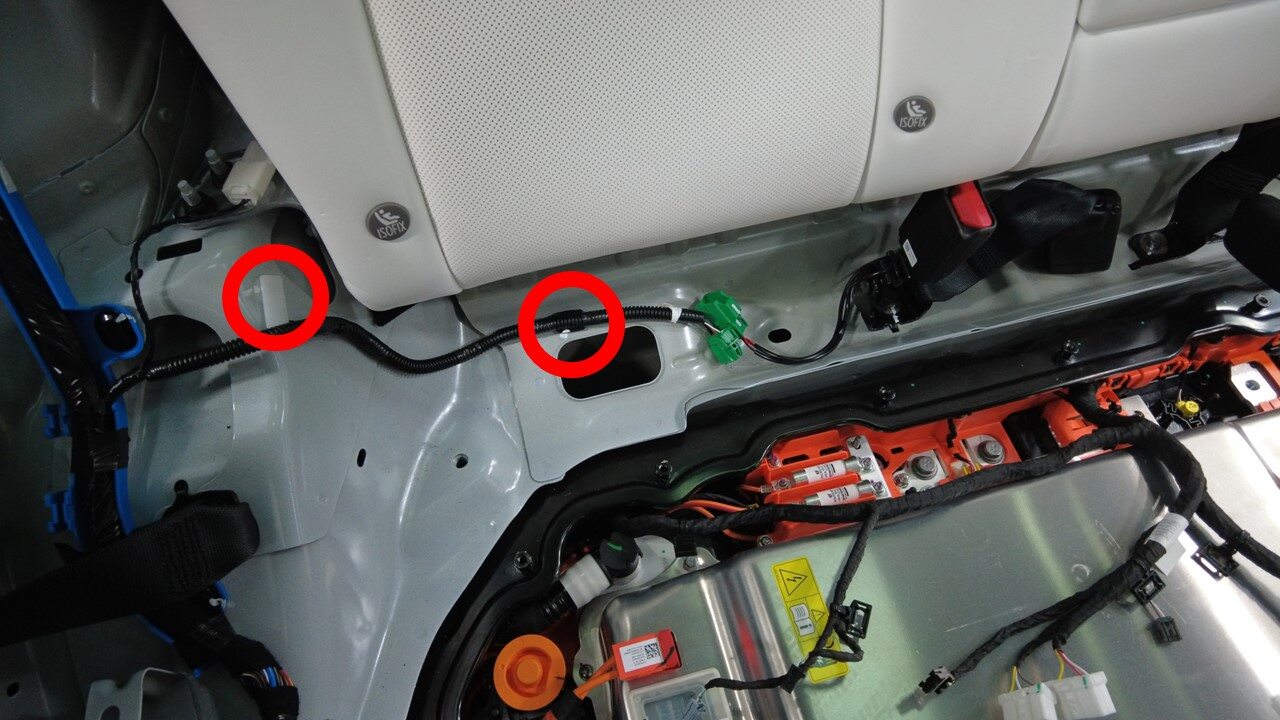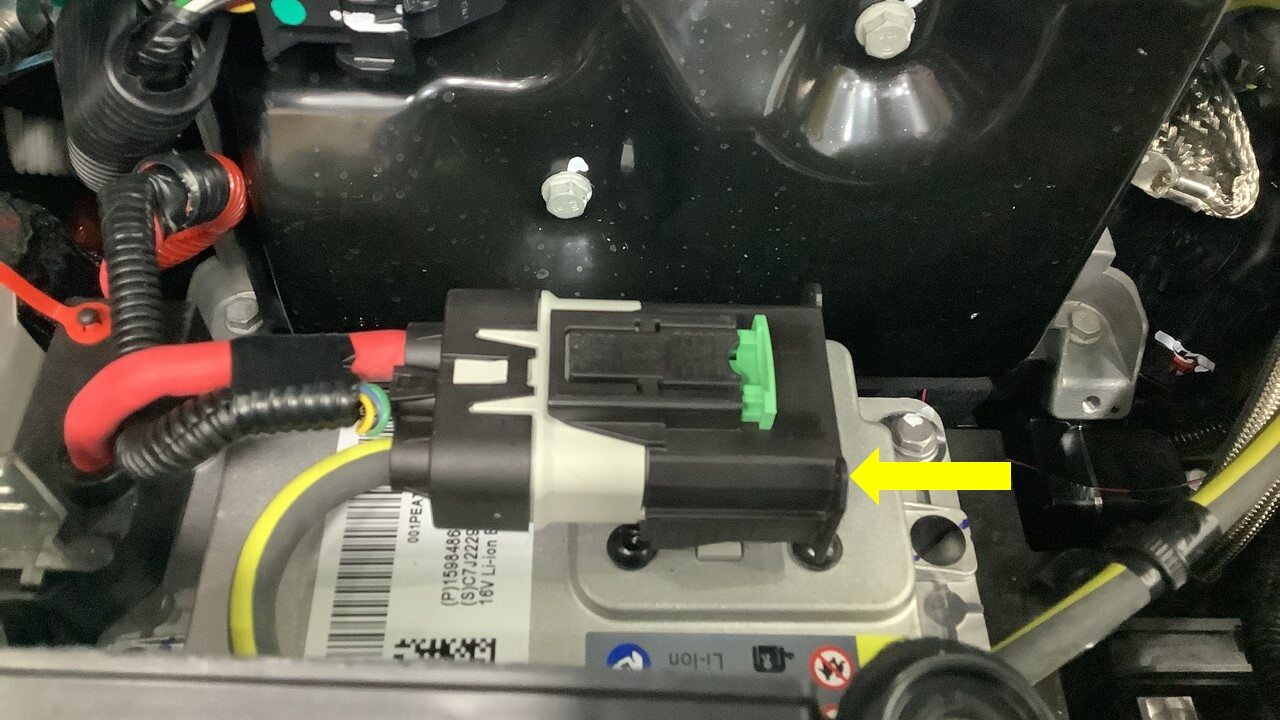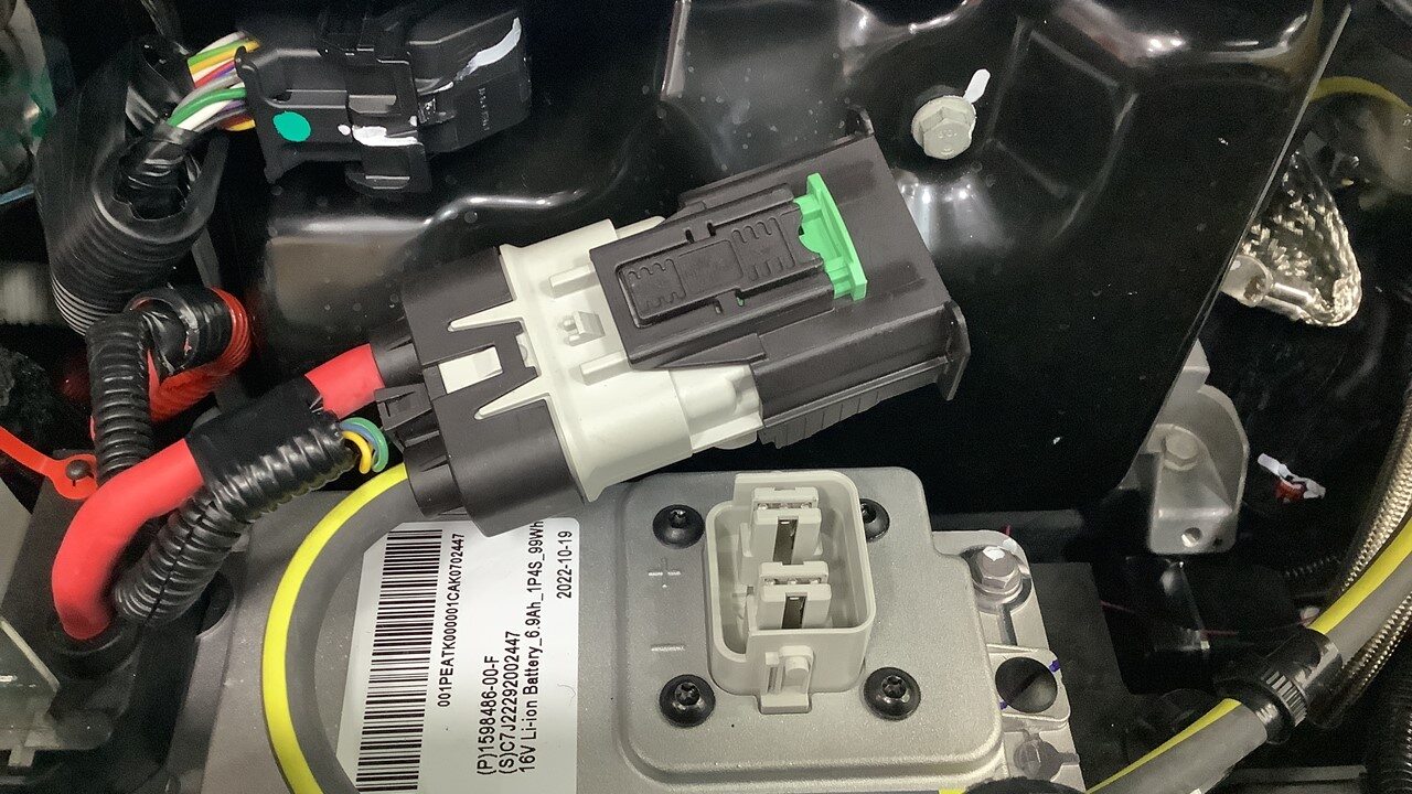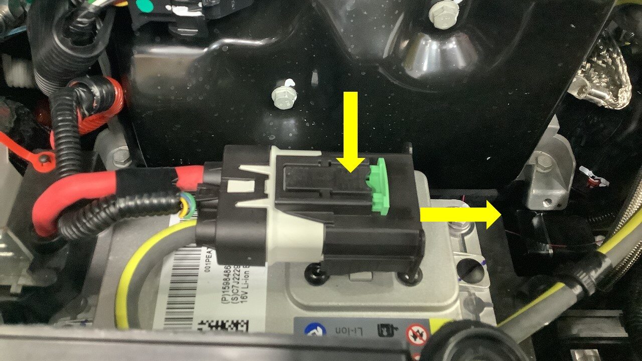 注2x connectors, Secure FRL first, Seat LV battery connection and push black connector lock inwards to secure, Engage green locking tab when fully seated