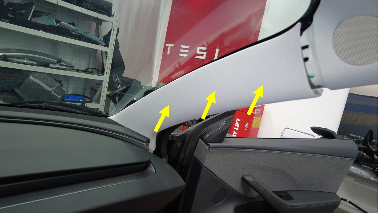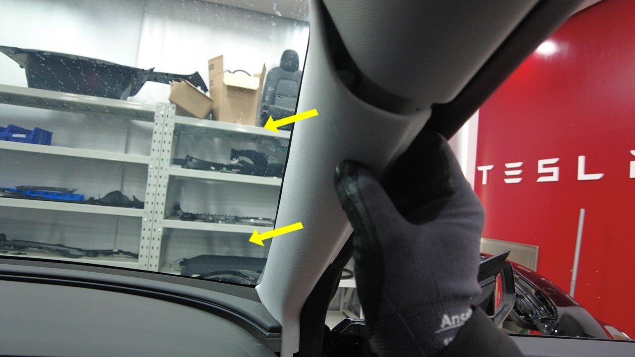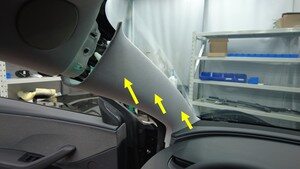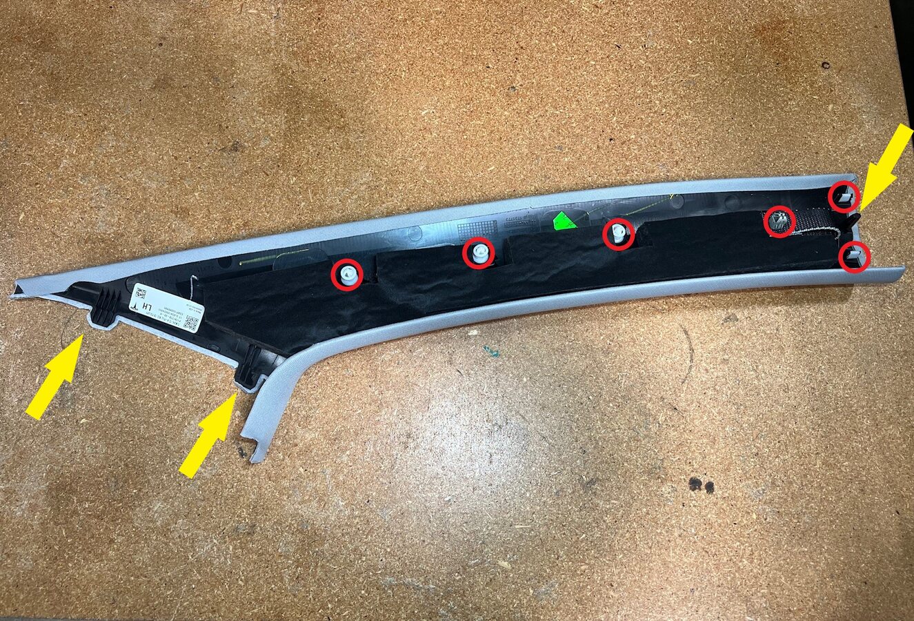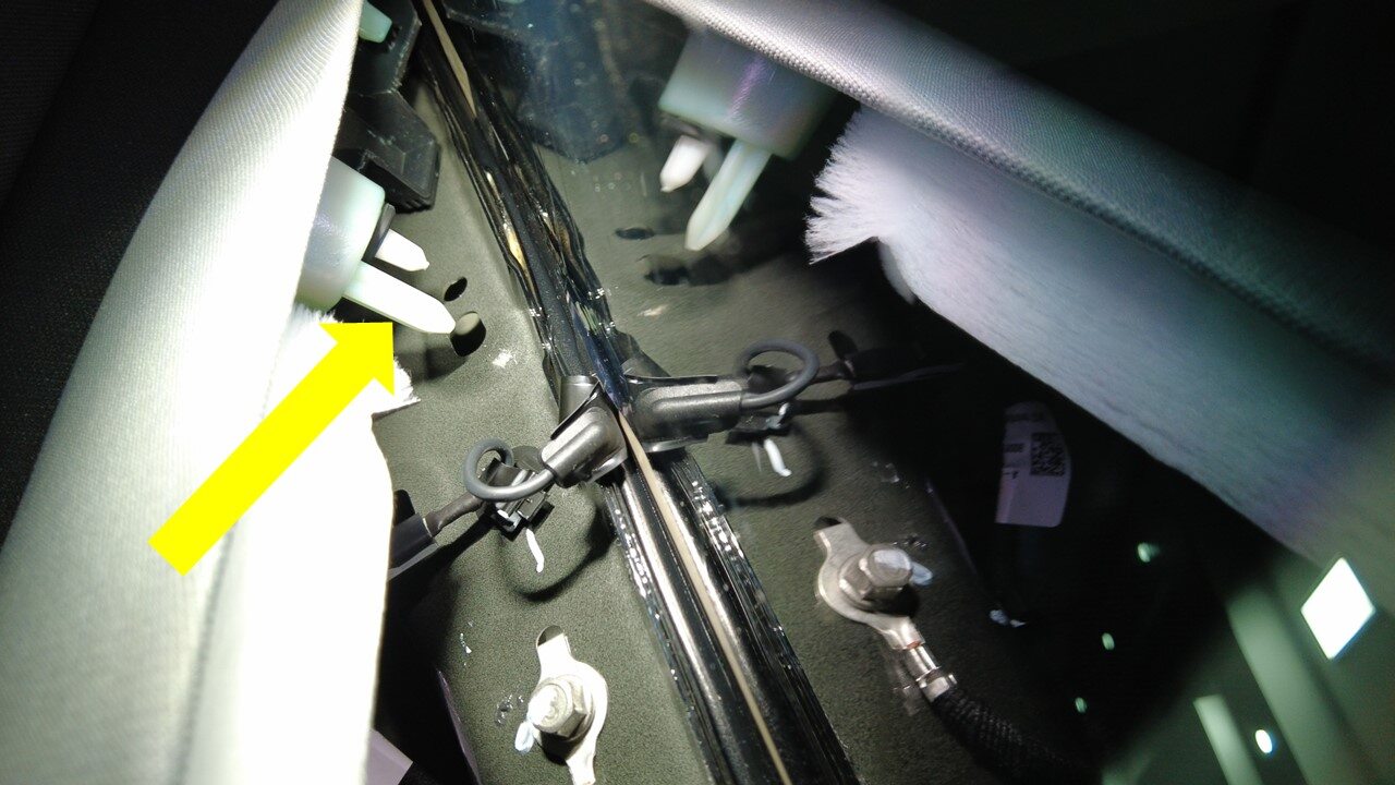 注6x clips, 1x tether, 2x guide tabs,1x alignment pin, Pull inside of the upper portion of upper A-pillar, Depress 2x tabs to remove tether from body side, Then pull upper A-pillar upward to remove