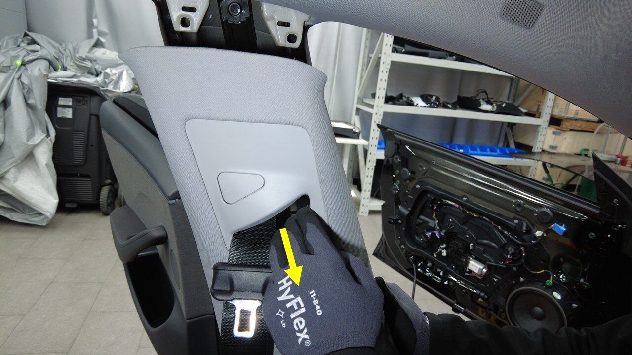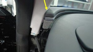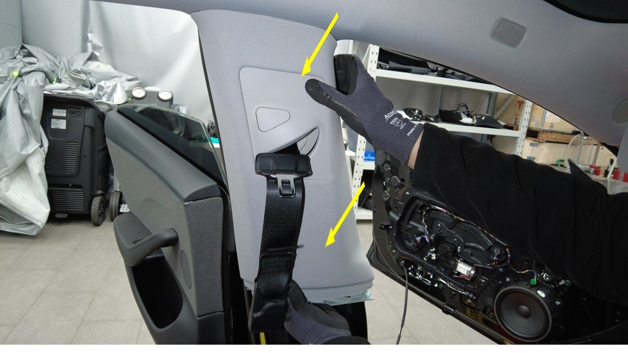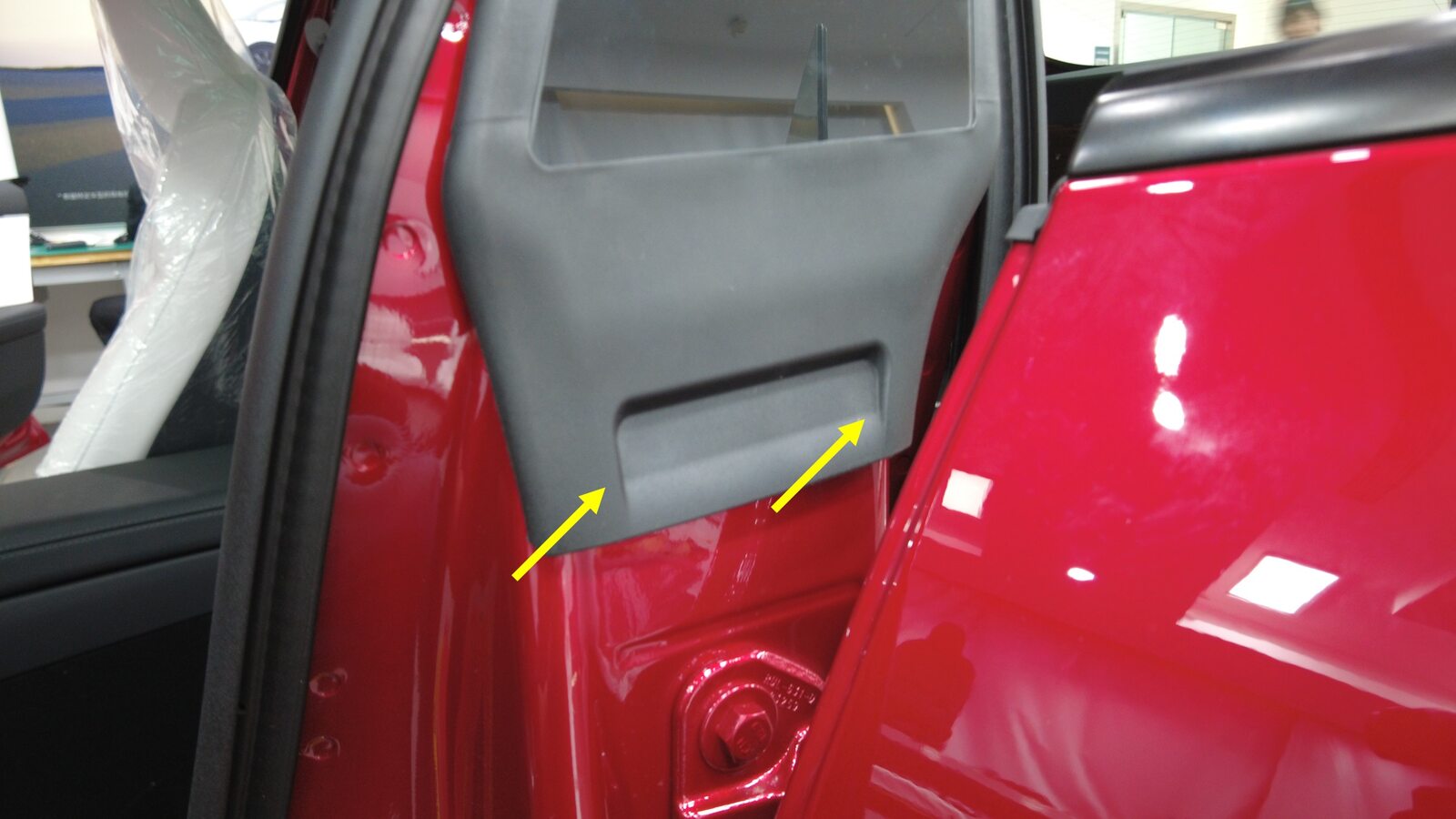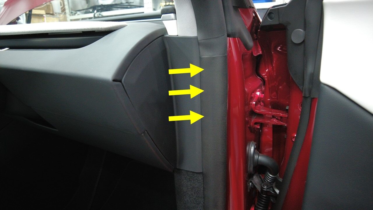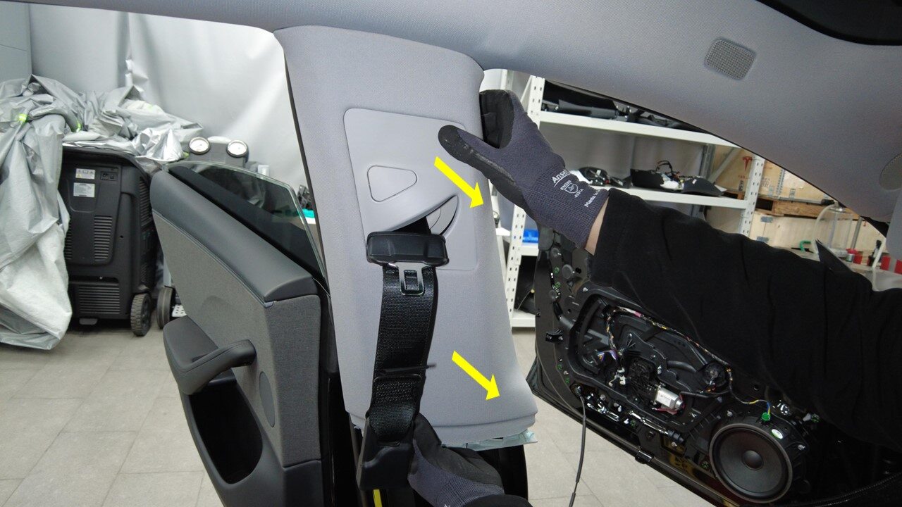 注3x clips,3x locator pins,Lower the seat belt slider to align it with the B-pillar panel, align the locating pin of the B-pillar upper trim panel with the slot, push in the direction of the arrow to install the clips after aligning them, Make sure the seal sits overlapping the trim