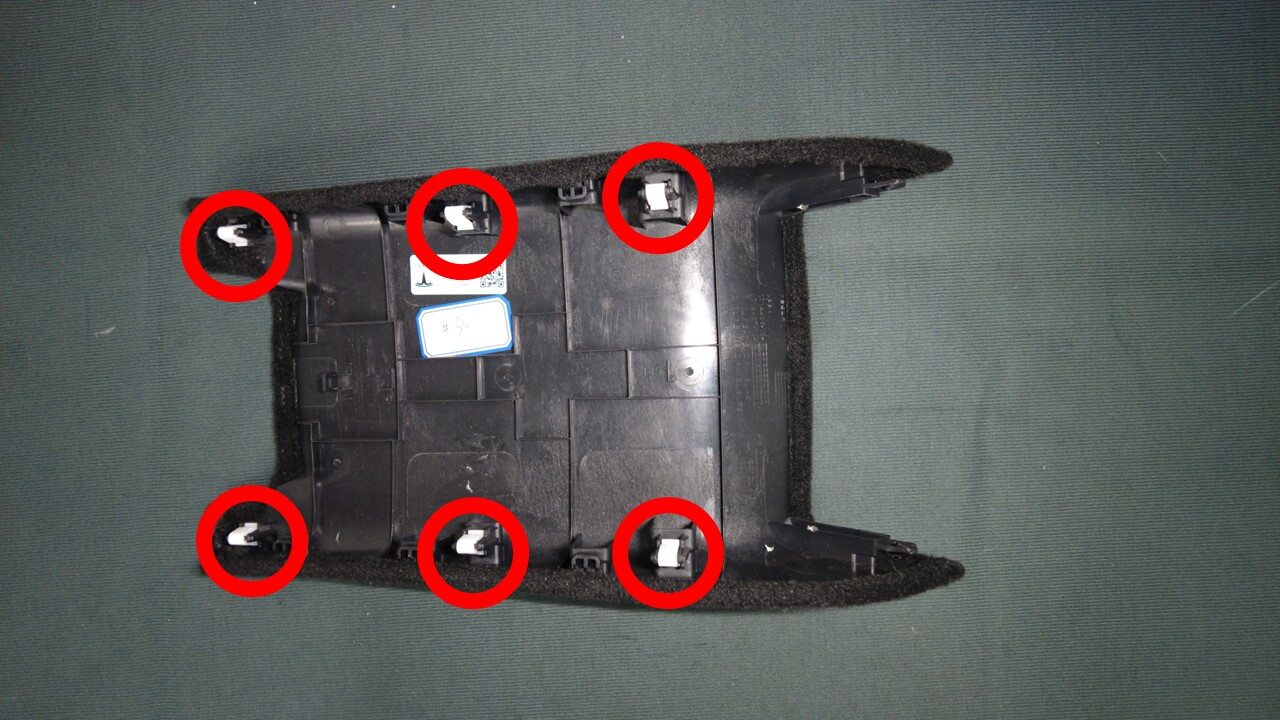注12x clips, 2x positioning clips, 1x datum, Position side panel and align front datum, Push console panel from front towards rear