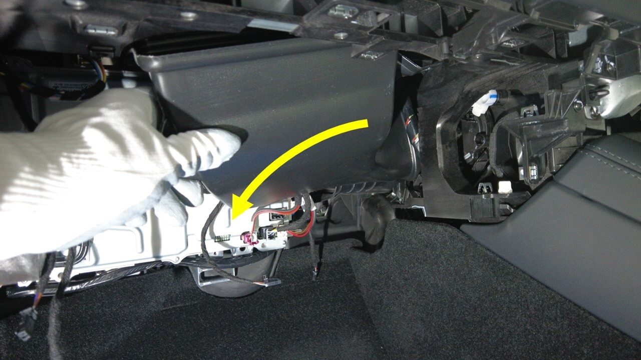 注Recommend assistance, Tilt rear of console upward, pull assembly towards rear of vehicle, then tilt front of console upward and remove through passenger side, Then Place on the work table