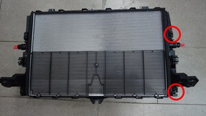 将散热器安装到冷却风扇和护罩总成上,然后安装将散热器固定到冷却风扇和护罩总成上的锁片(2 个)和固定支座(2 个)。