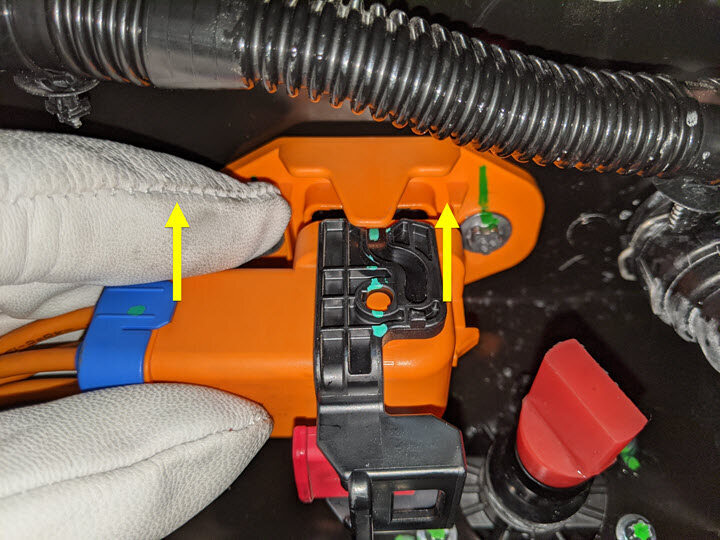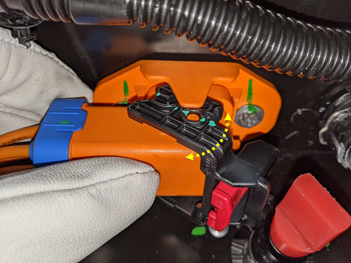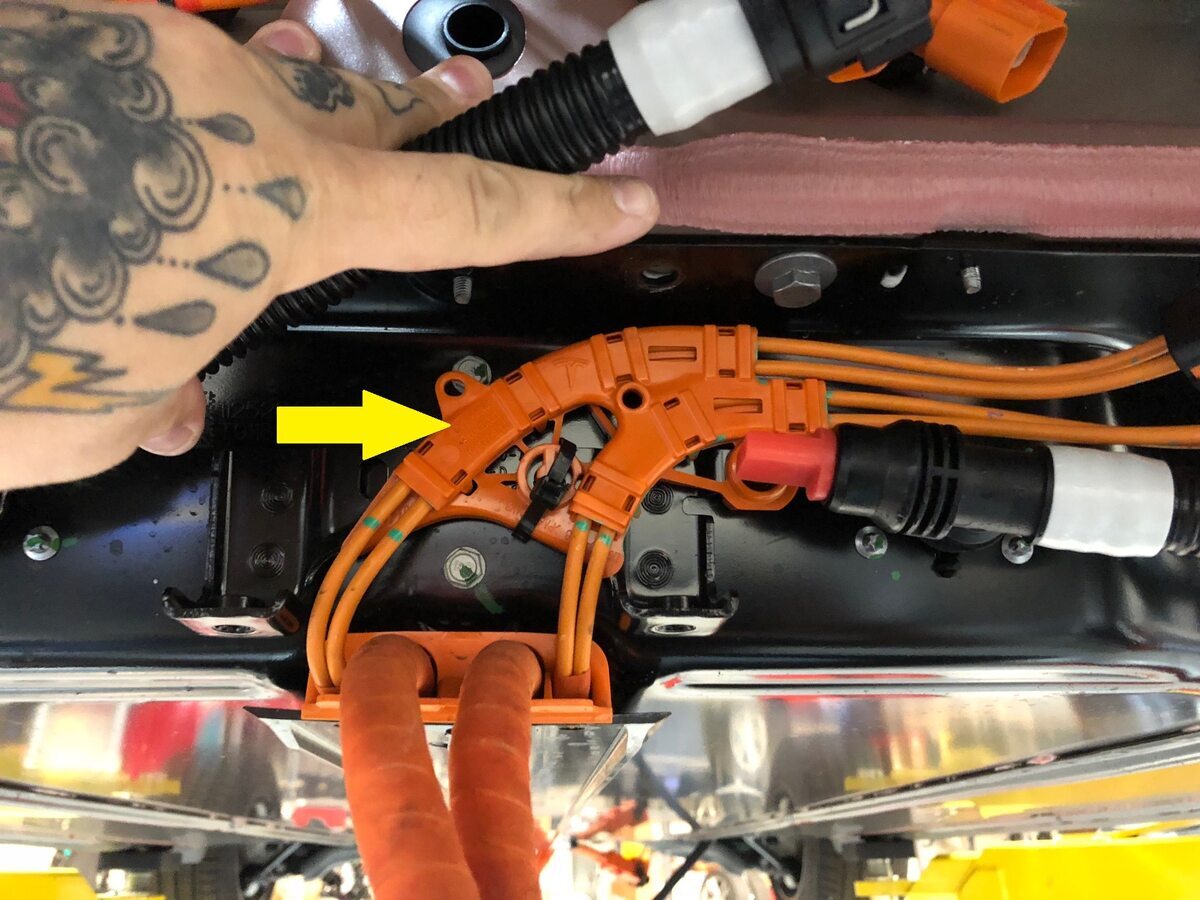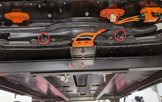 拆下左前座椅座垫后端下方的高压电池螺栓。