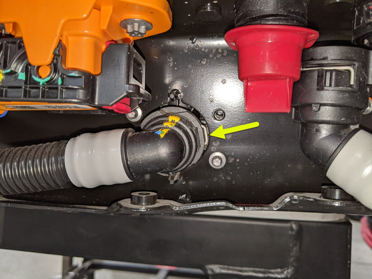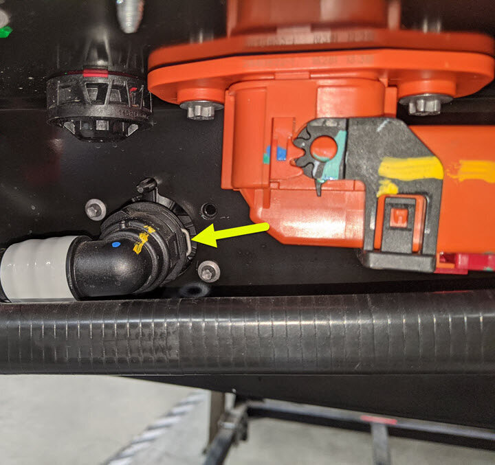 注等待冷却液泵停止运行(可听见噪音),界面上将出现“例行程序完成”,但冷却液泵将继续运行 10 分钟,如果在这段时间内开始执行下一例行程序,该例行程序将运行失败。确保车辆未处于“前进挡”,即使出现完成消息,例行程序仍在运行,怠速 = 约1500 RPM,测试中,速度将在 3500-6500 RPM 之间变化,启动的阀门将在串联和并联之间切换,将车辆置于“行驶”状态,此例行程序将停止。如果速度在 7000 RPM 左右徘徊,则说明冷却液泵存在气锁状况,请进行真空加注;继续添加冷却液并排空空气,直至冷却液液位介于冷却液罐上的 NOM 与 MAX 线之间