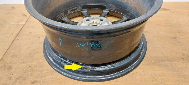 将轮毂放置在工作台上,使气门嘴孔朝向你。
