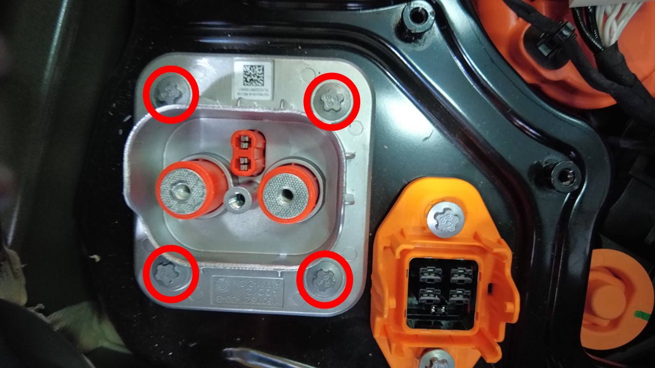 Remove bolt securing positive fastcharge busbar inlet side and positive DC input assembly busbar.