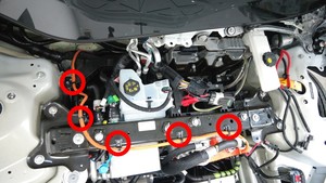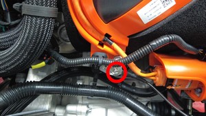 拆卸将低压电池和紧急响应回路固定到减震塔支架的固定夹。